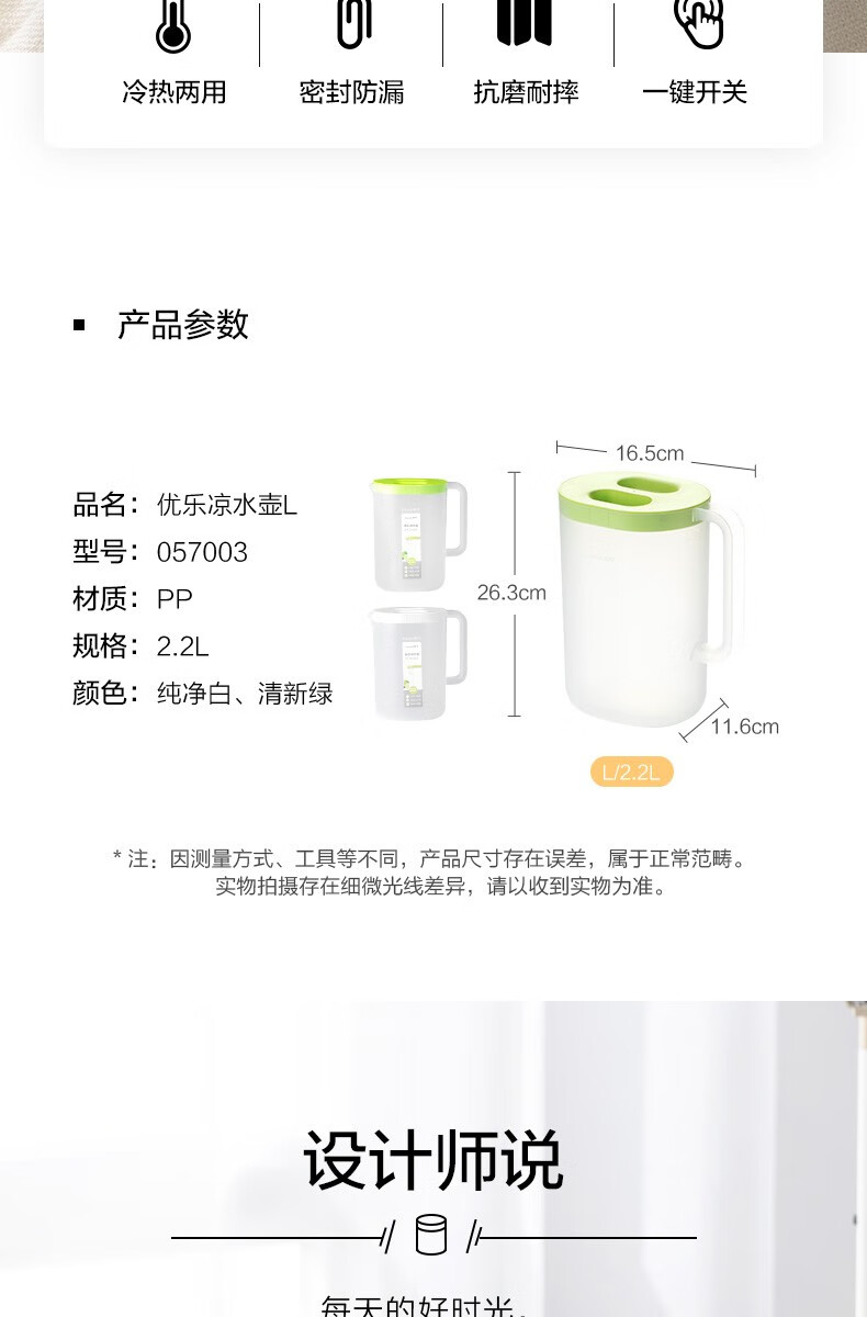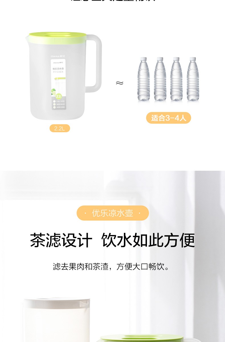 茶花(CHAHUA)茶花冷水壶 塑料大容量透明凉水壶凉水杯果汁壶冷饮壶 【2.2L】优乐凉水壶L-透明绿