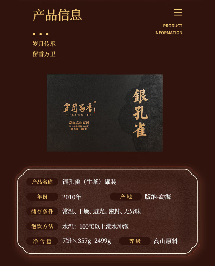 岁月留香2010普洱银孔雀生茶罐装滋味醇厚甘润100g礼盒装