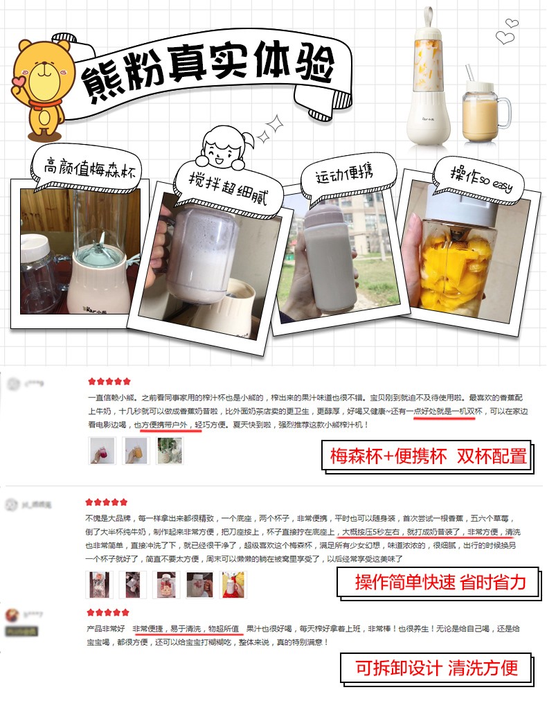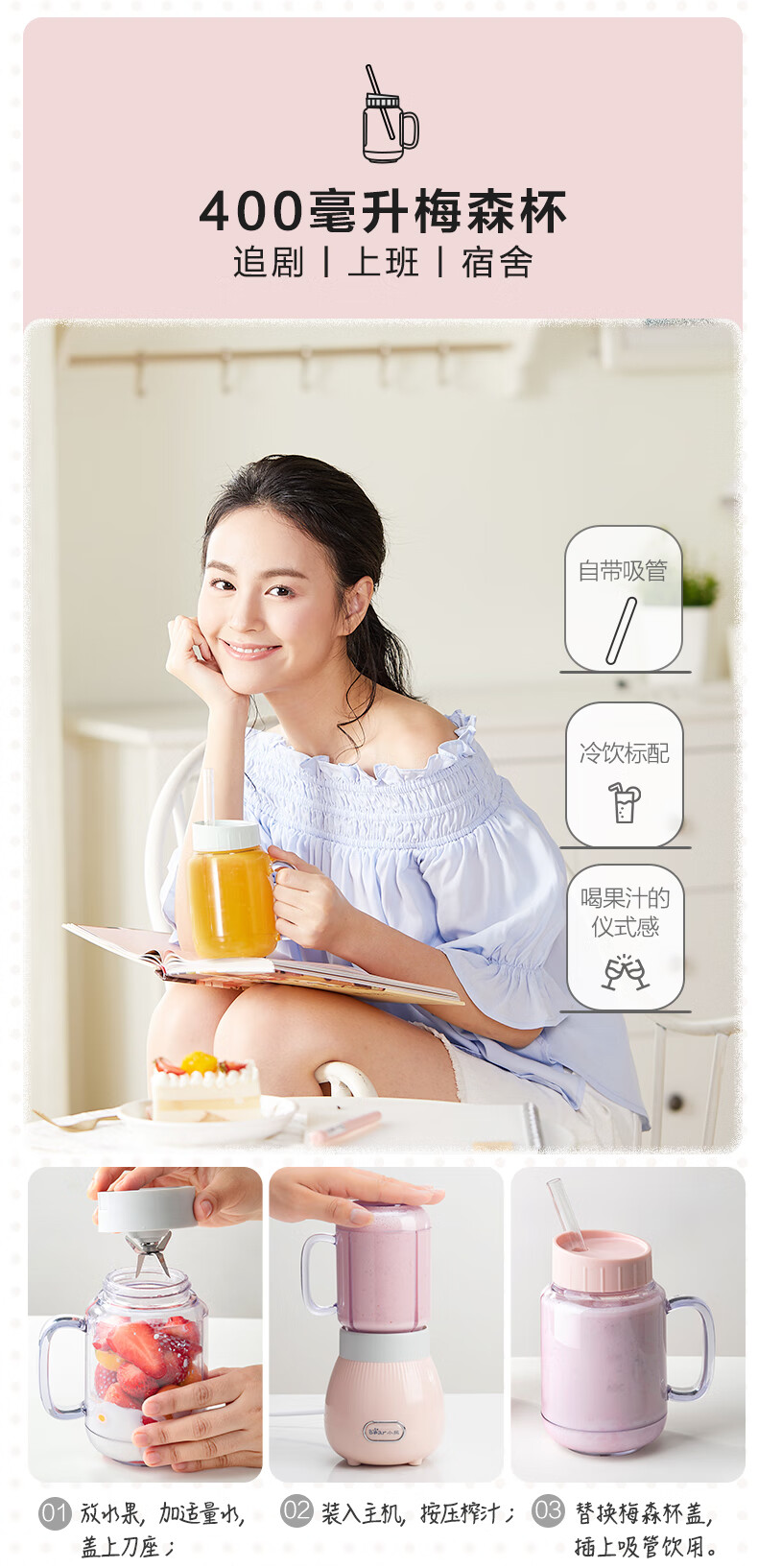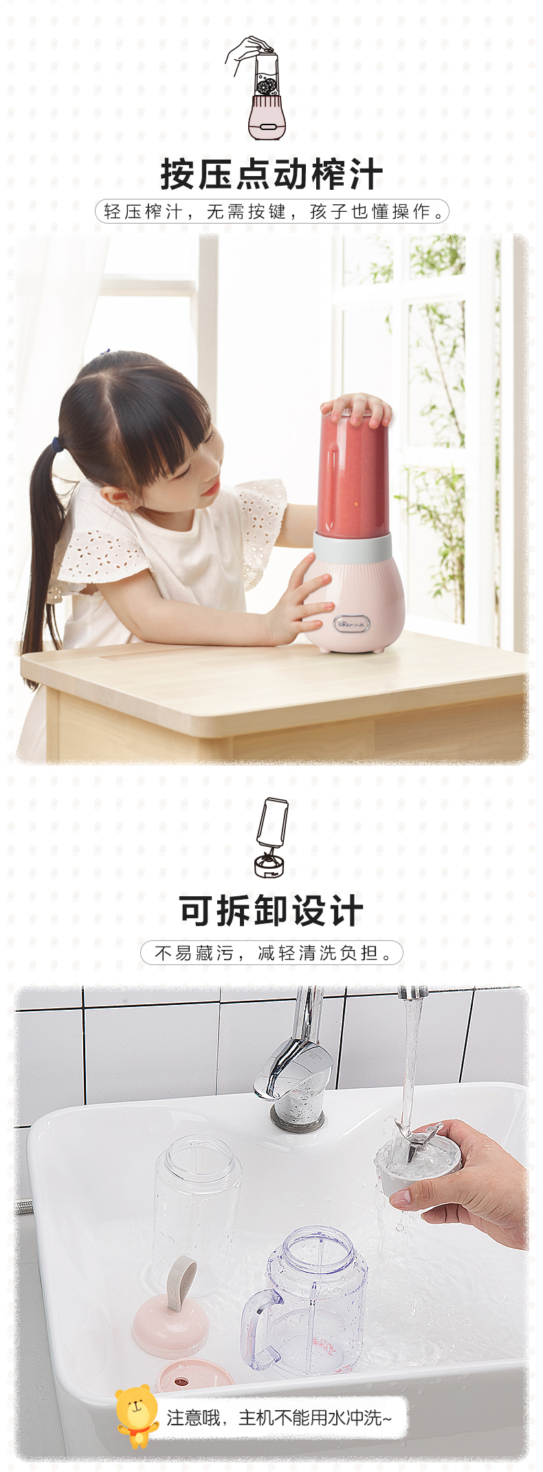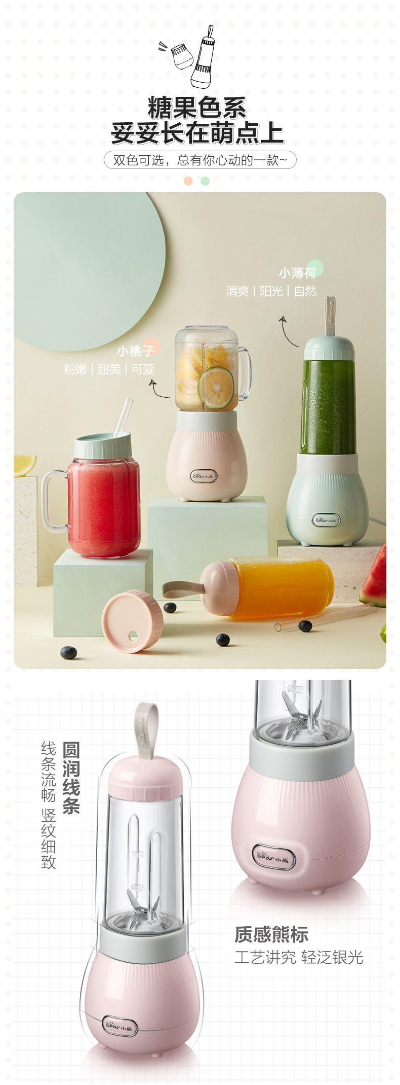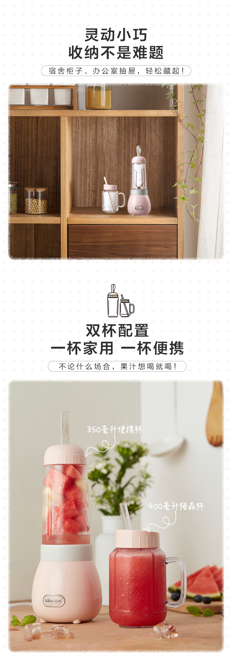 小熊(Bear) 便携式榨汁机家用迷你水果小型炸果汁机料理机电动多功能榨汁杯随身携带 LLJ-C04W1 粉色双杯