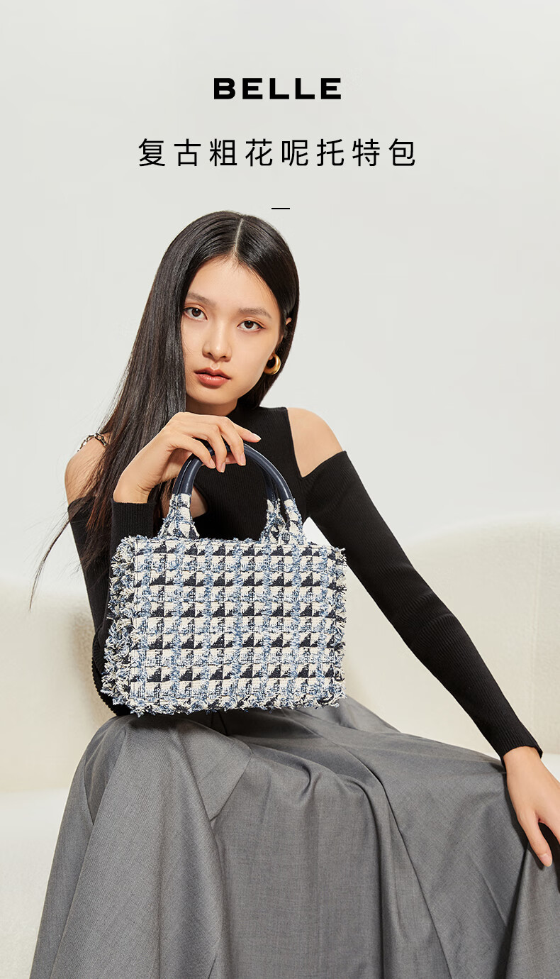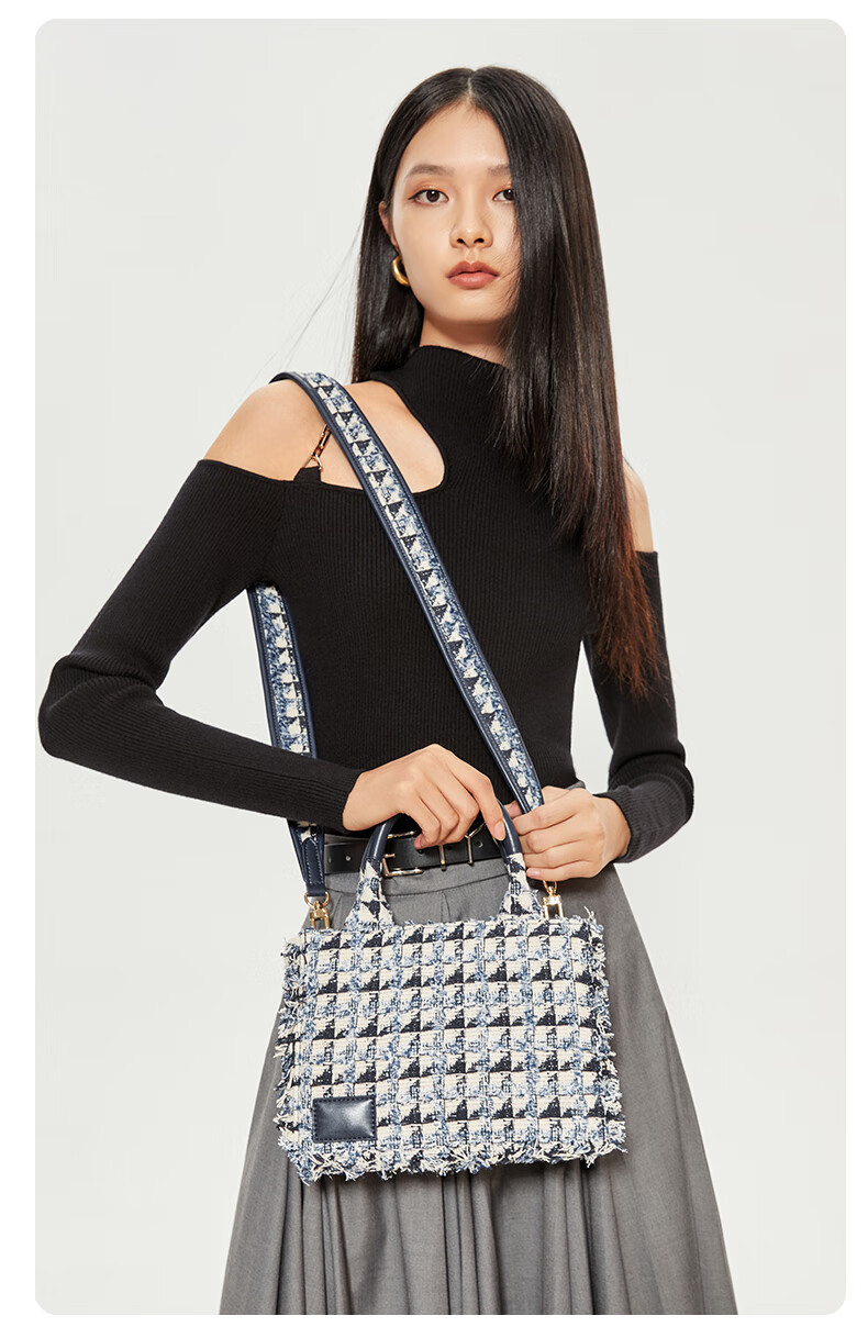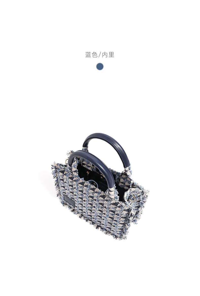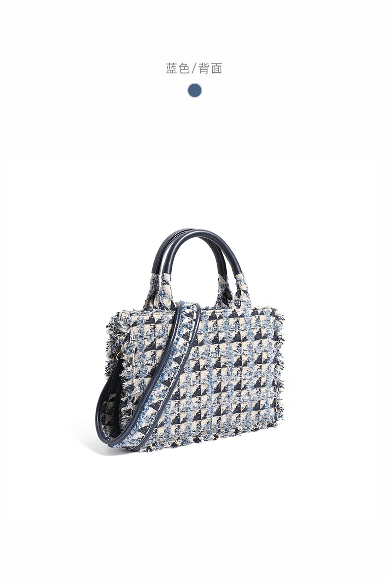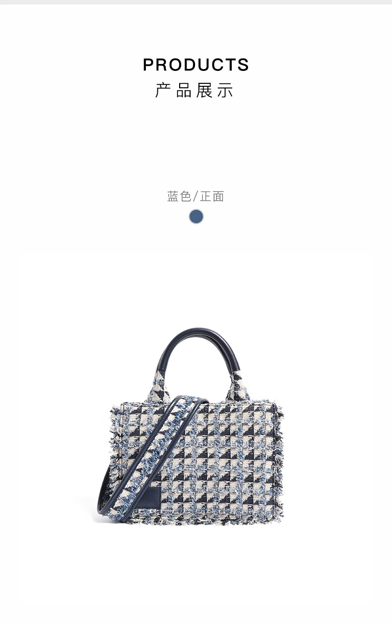 百丽复古优雅粗花呢托特包单肩斜挎手提包X6388DX2 蓝色 F