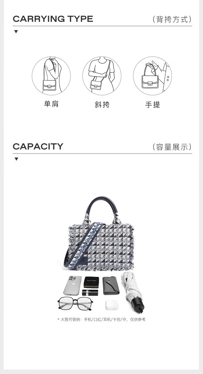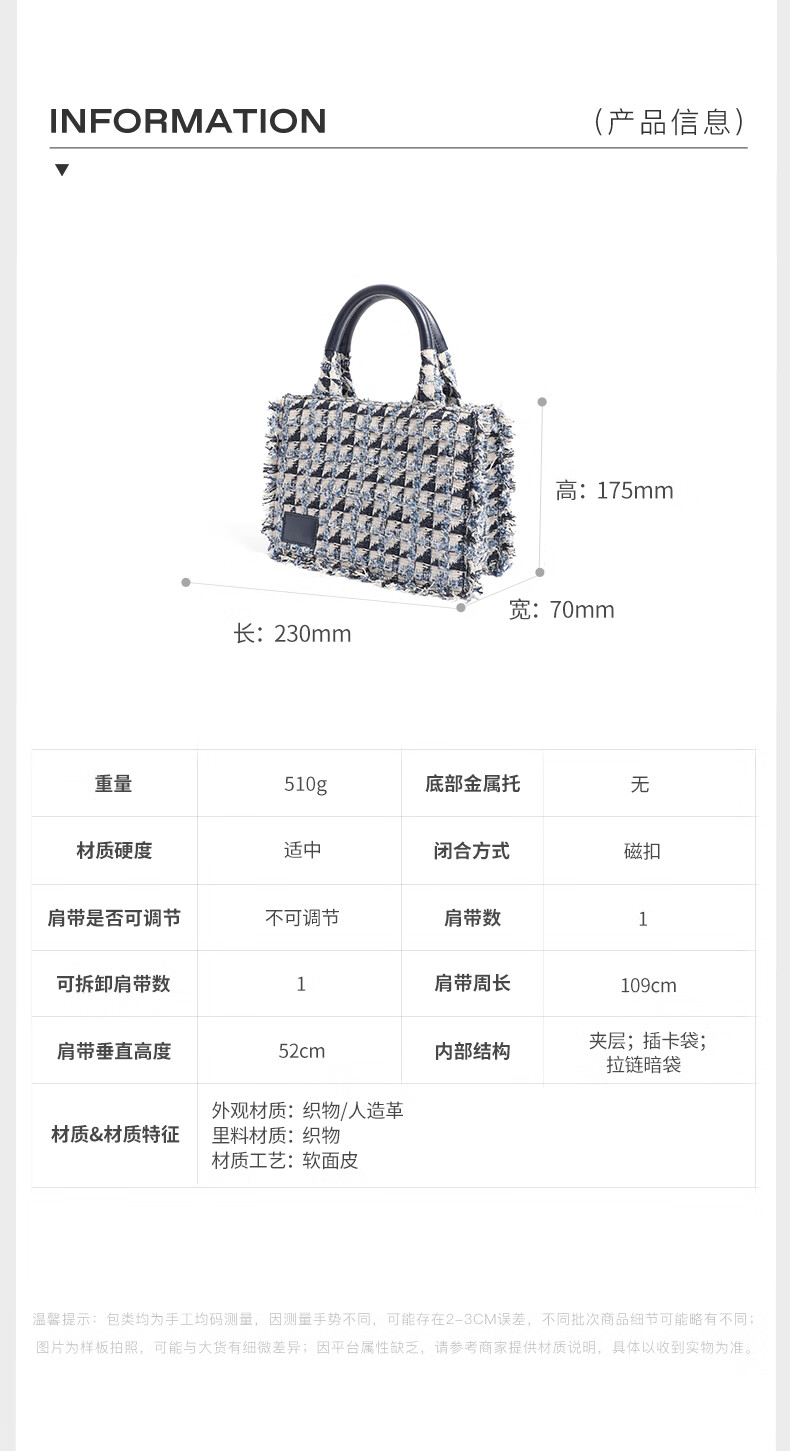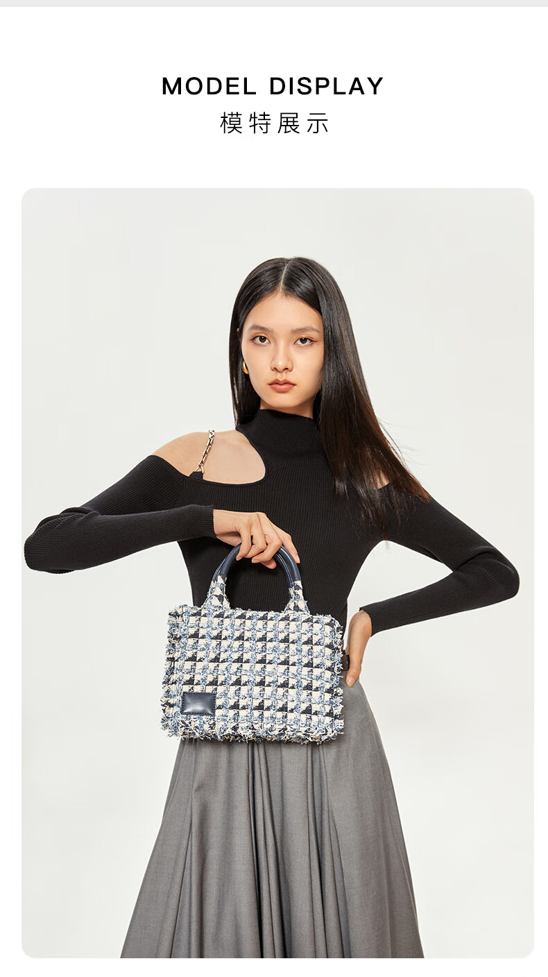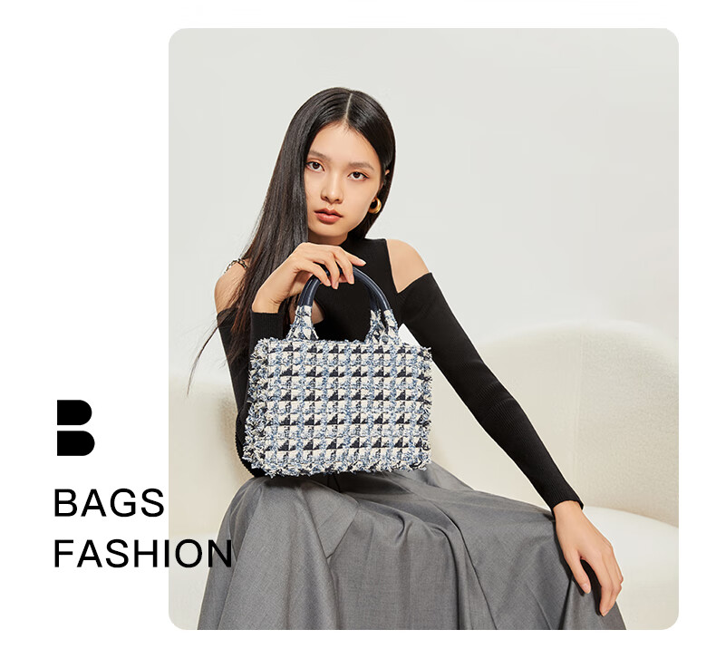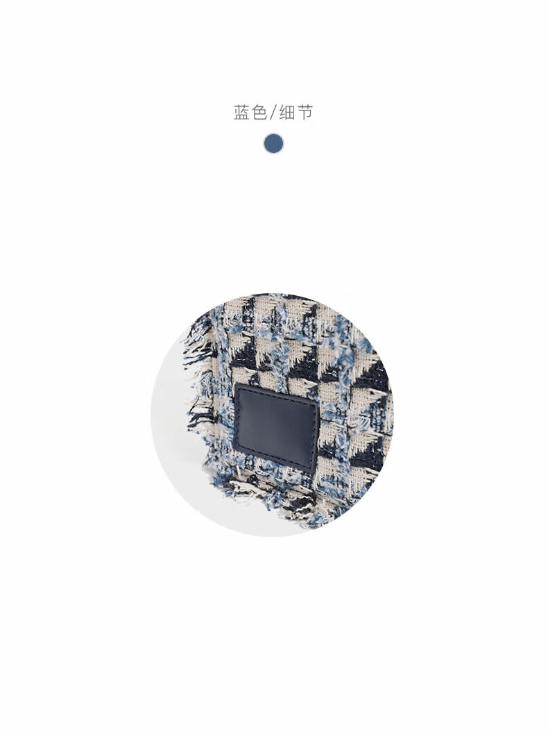 百丽复古优雅粗花呢托特包单肩斜挎手提包X6388DX2 蓝色 F