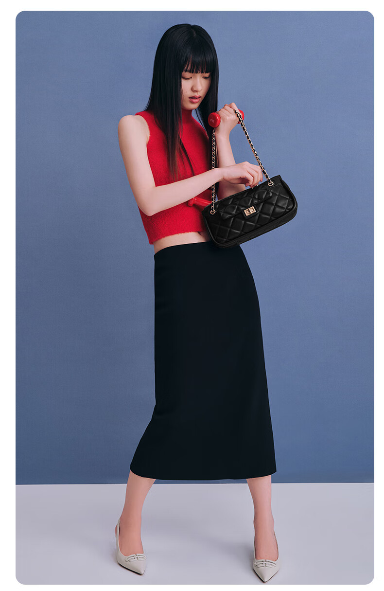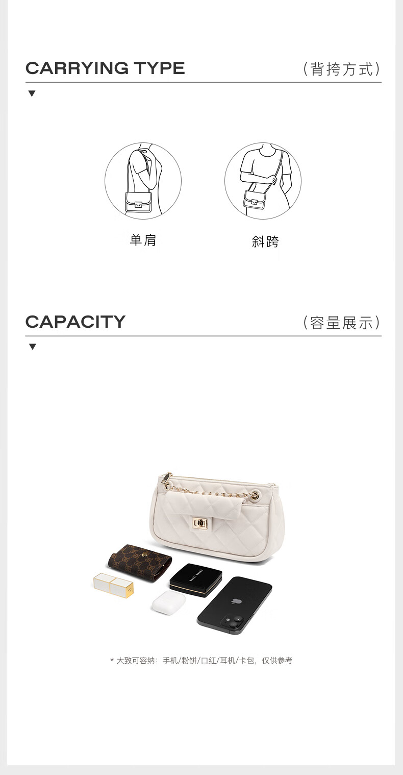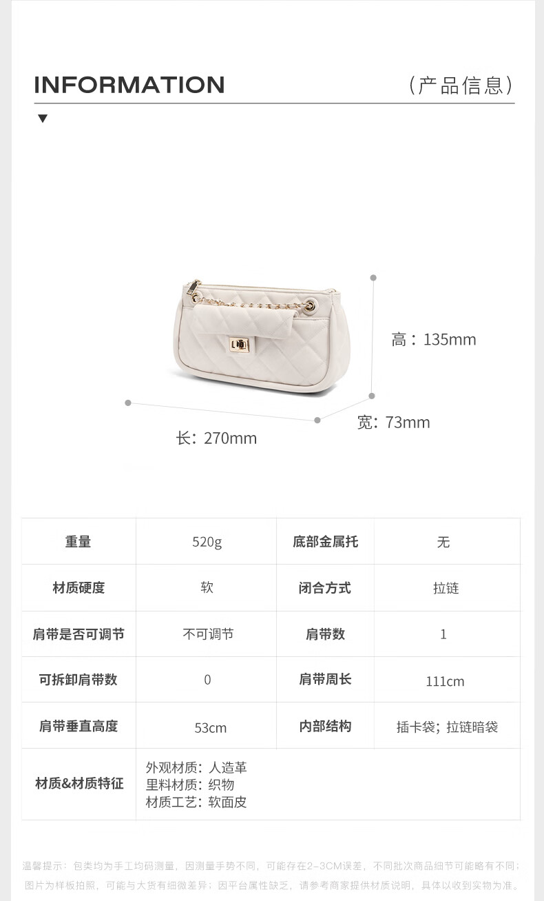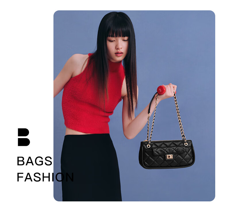 百丽包包女2023夏季新款休闲法棍绗缝包小香风轻奢单肩斜挎包X9095BX3 黑色 F