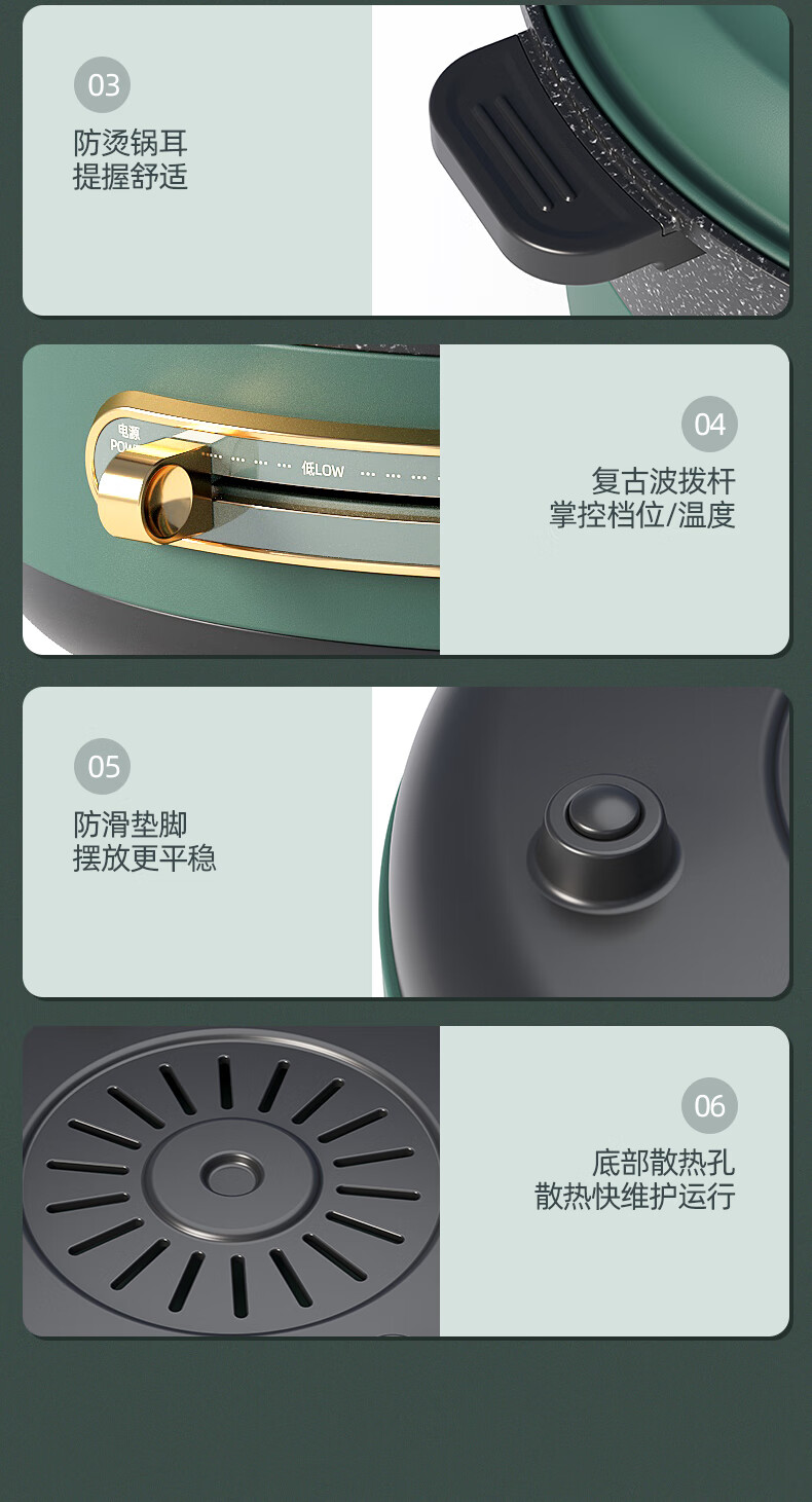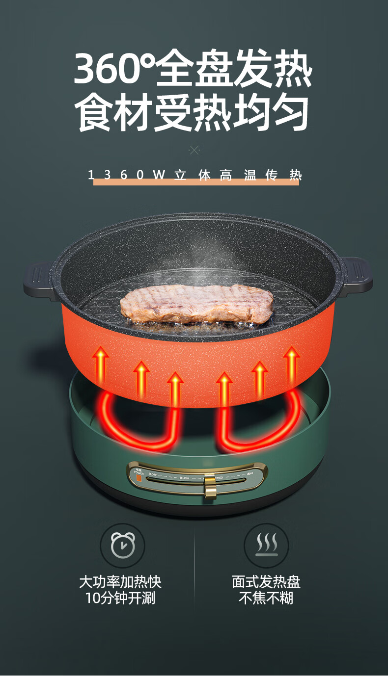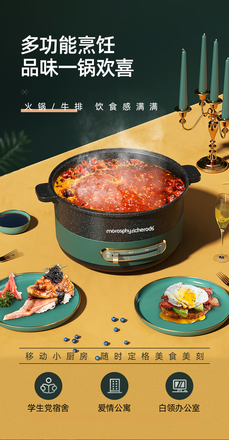 morosphy richerods多功能锅 家用多用途锅 电火锅料理锅电热锅电煮锅 4升 火锅锅 墨绿色 MF-202C
