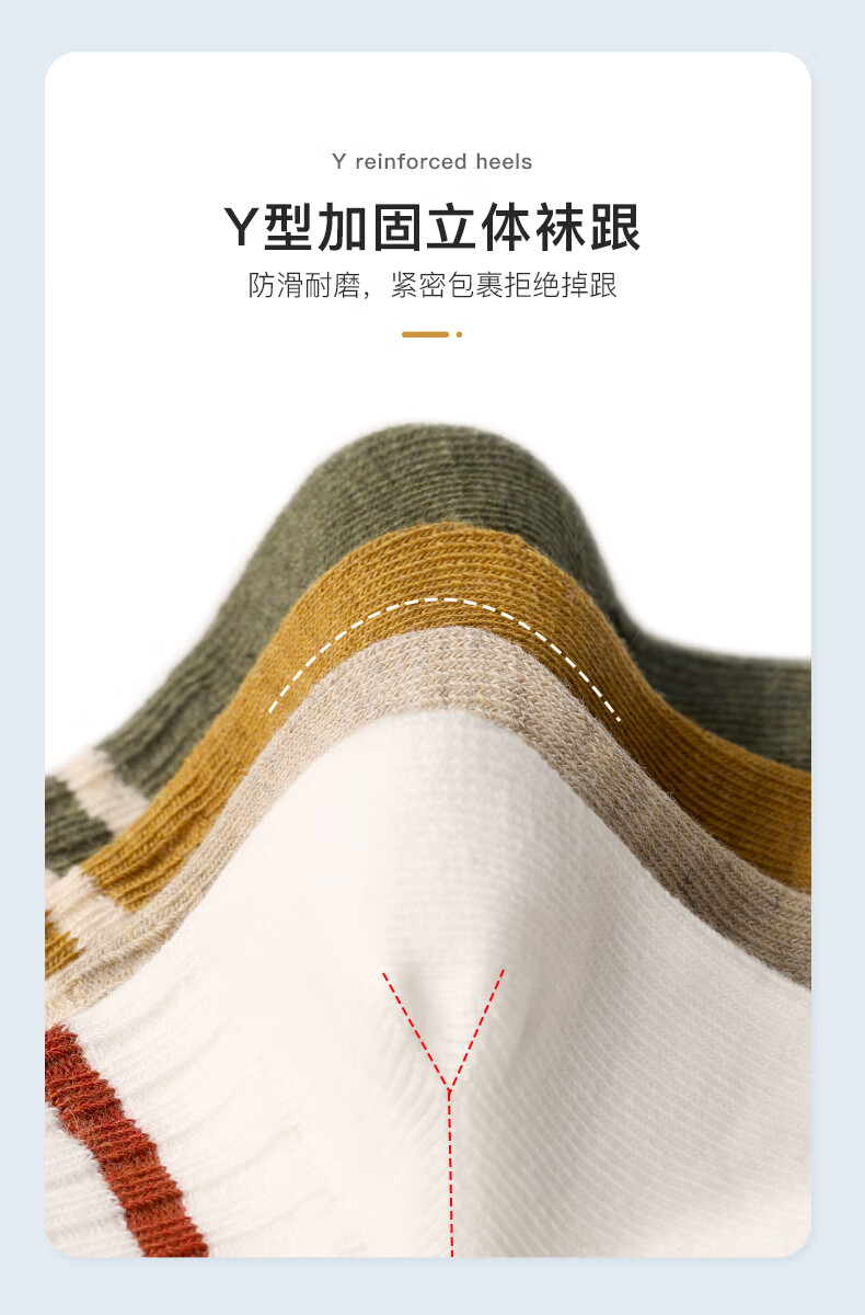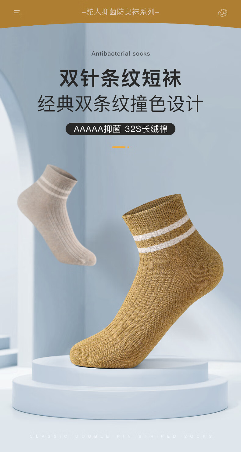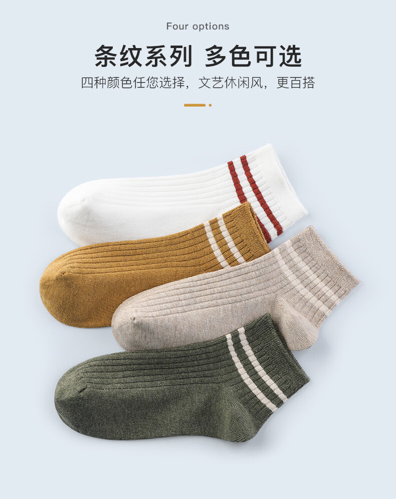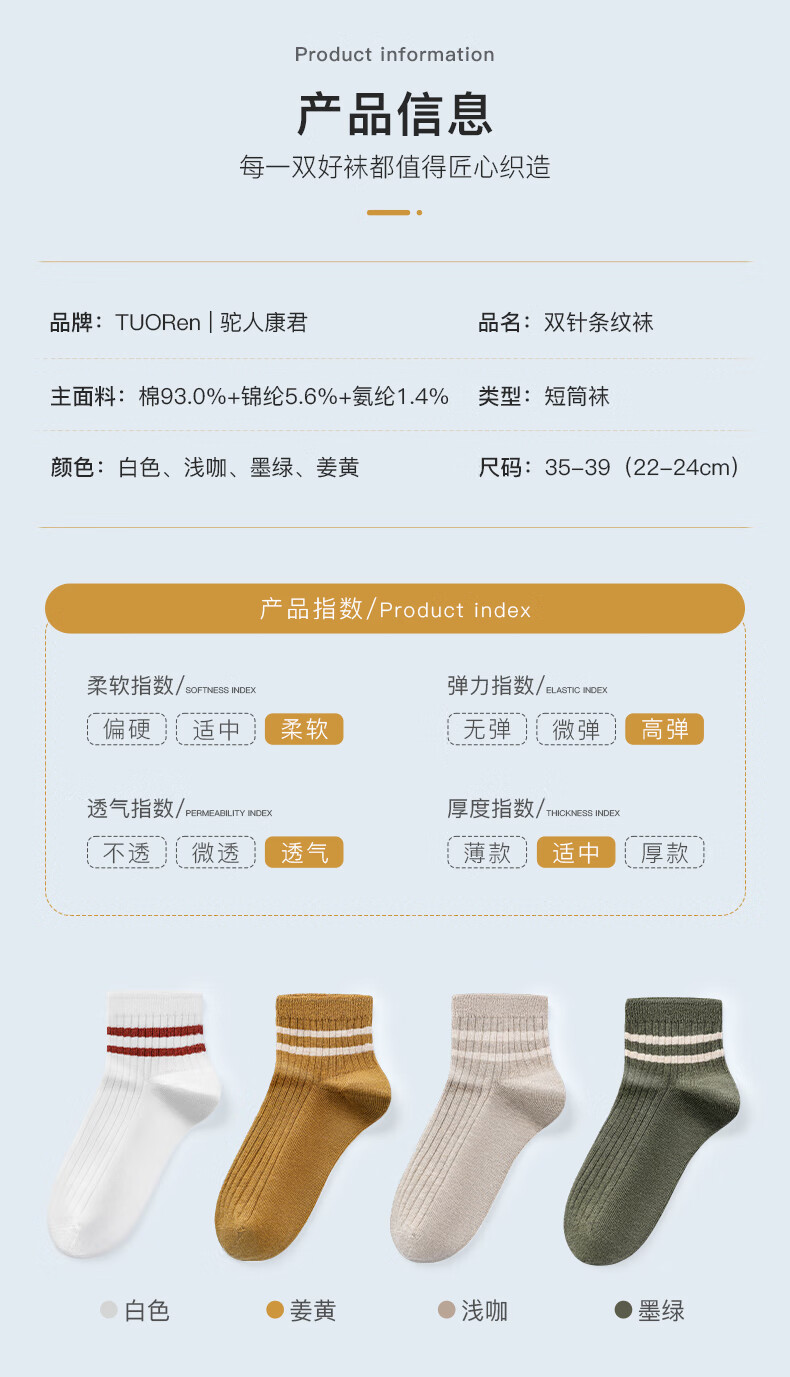 驼人康君女士袜子抑菌防臭四季款经典条纹撞色双针织工艺短筒女袜学生高棉 白/浅咖/墨绿/姜黄-4双装