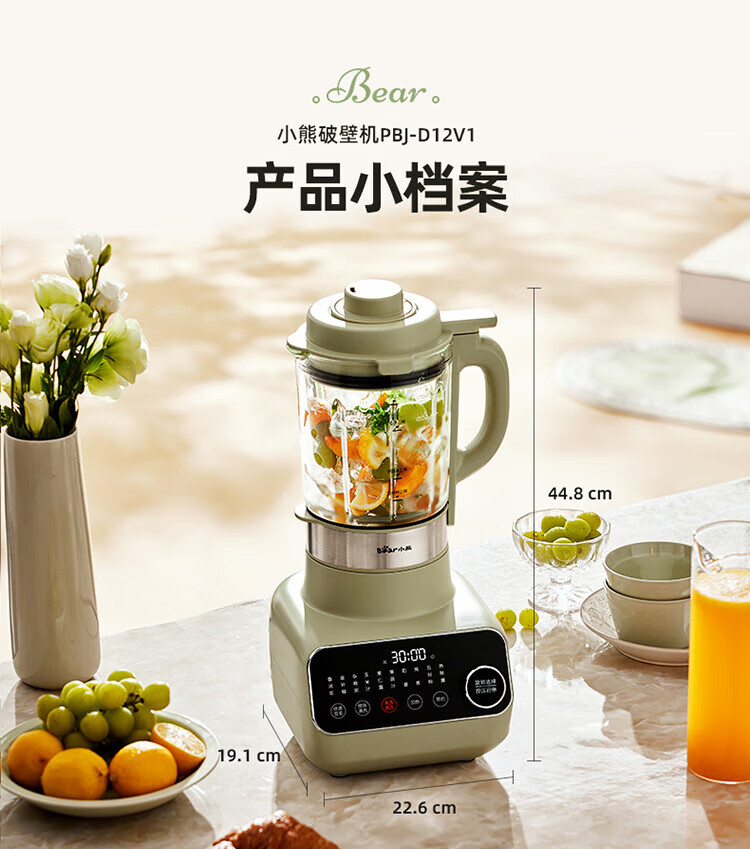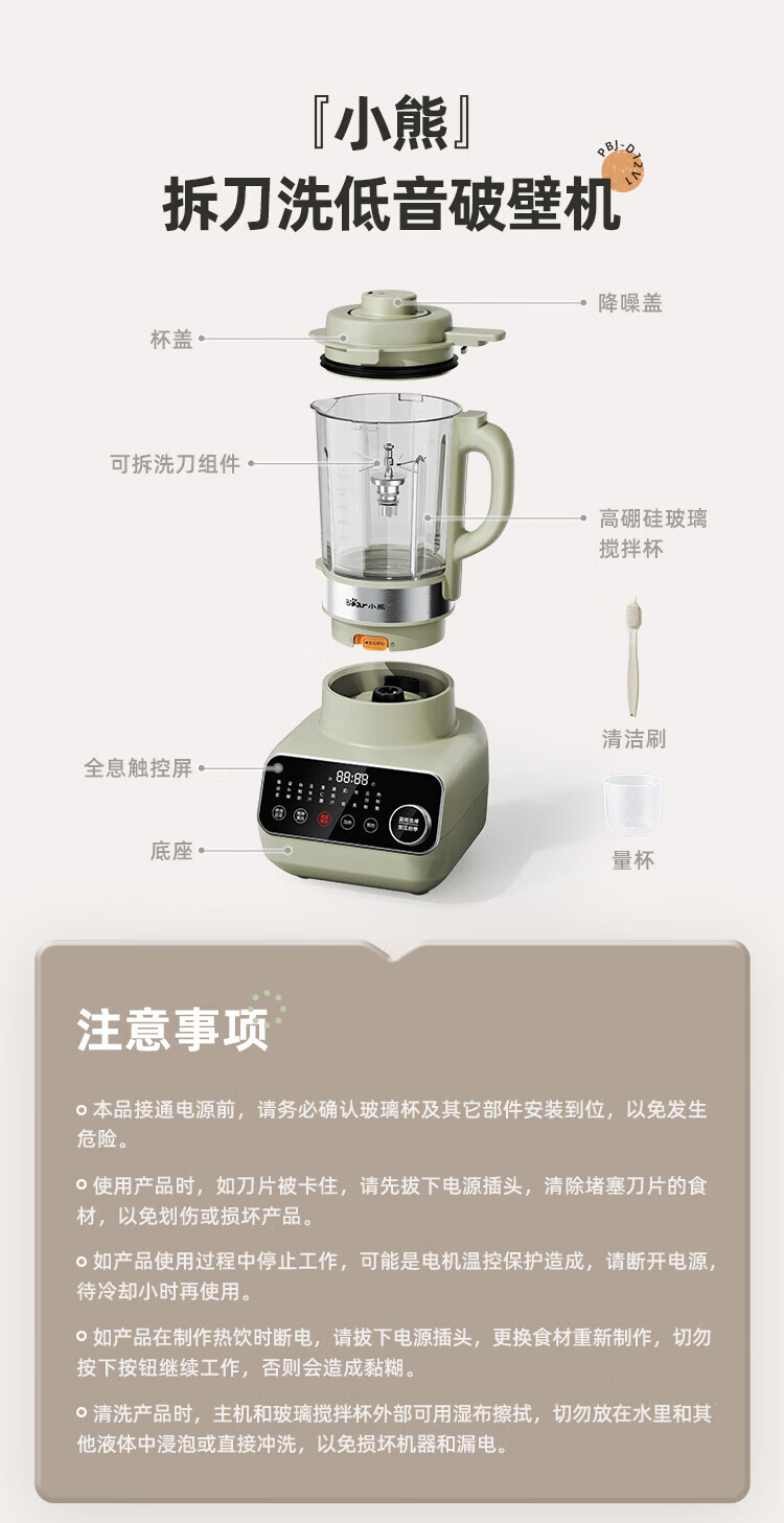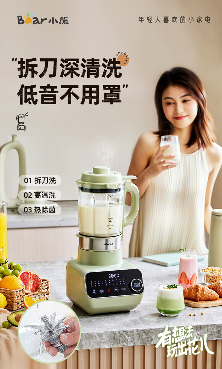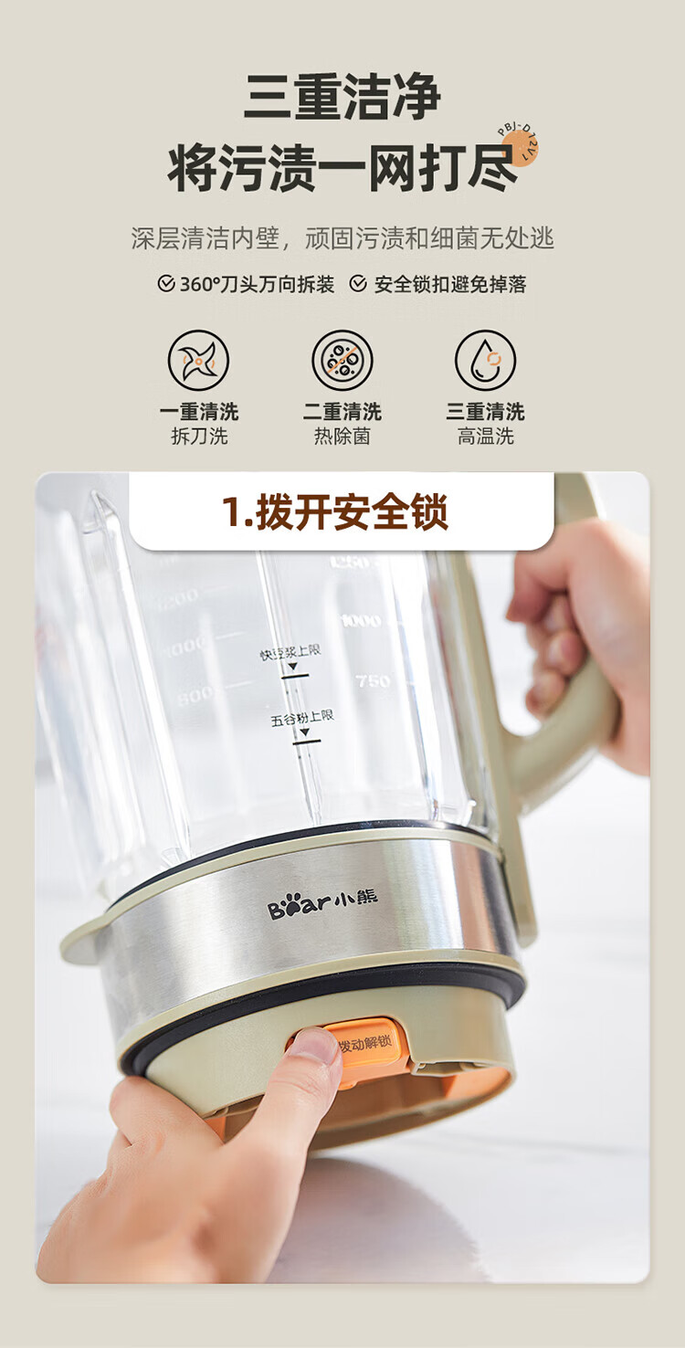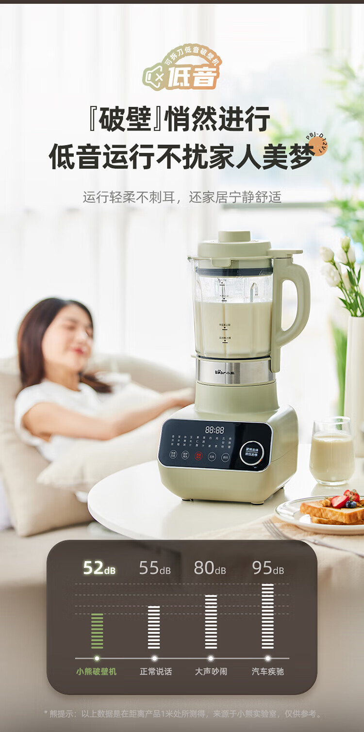 小熊(Bear)低音破壁机 可拆刀洗 家用多功能小型豆浆机 热除菌清洗 碎冰降噪智能预约 52分贝 PBJ-D12V1 可拆刀款
