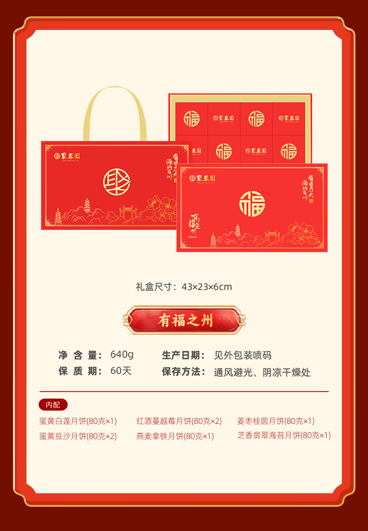 聚春园官方月饼礼盒装 玫瑰豆沙蛋黄莲蓉芋泥多口味流心中秋节送礼团购 有福之州礼盒 640g【8个月饼】