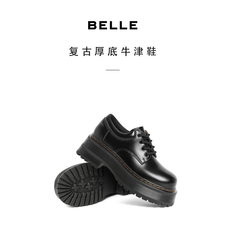 百丽英伦风牛津鞋女2023秋季新款粗跟高复古皮鞋B1565CM3预售 黑色 35