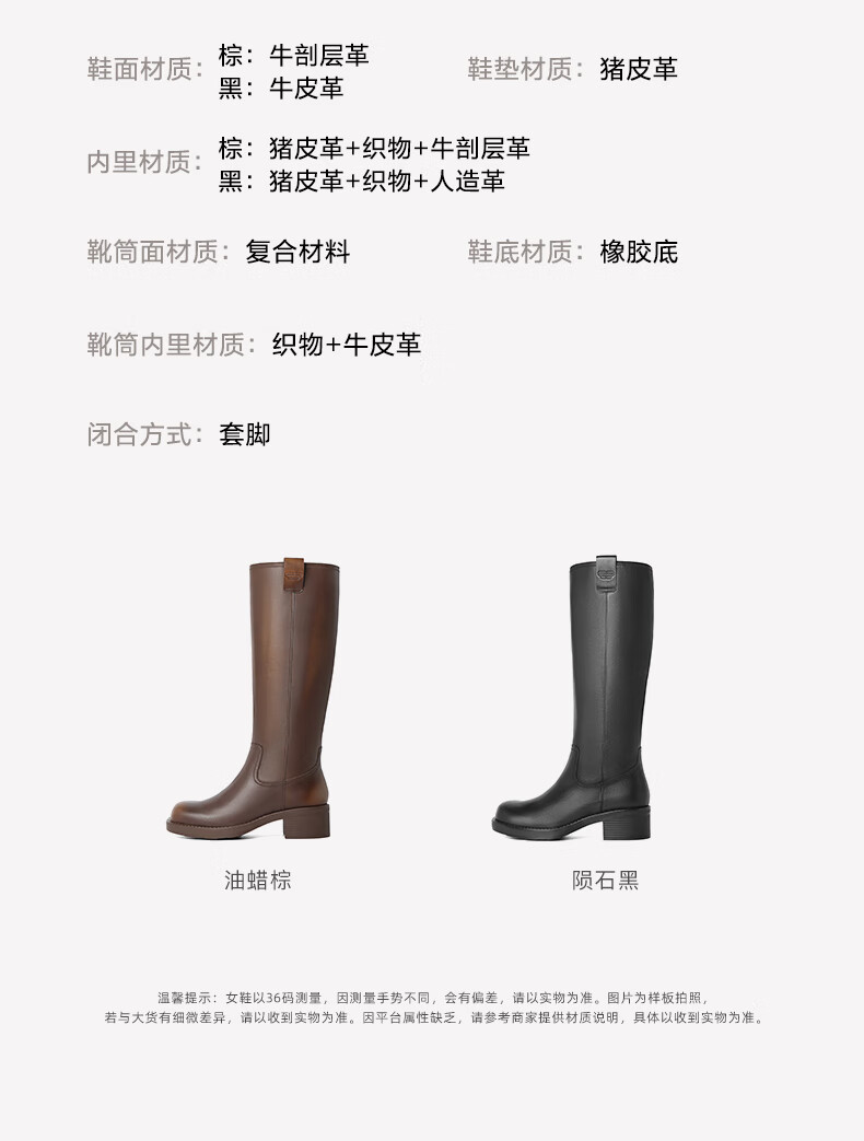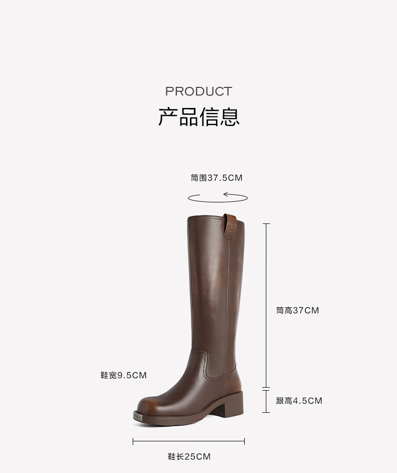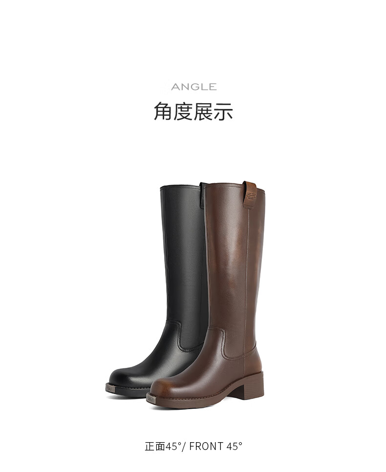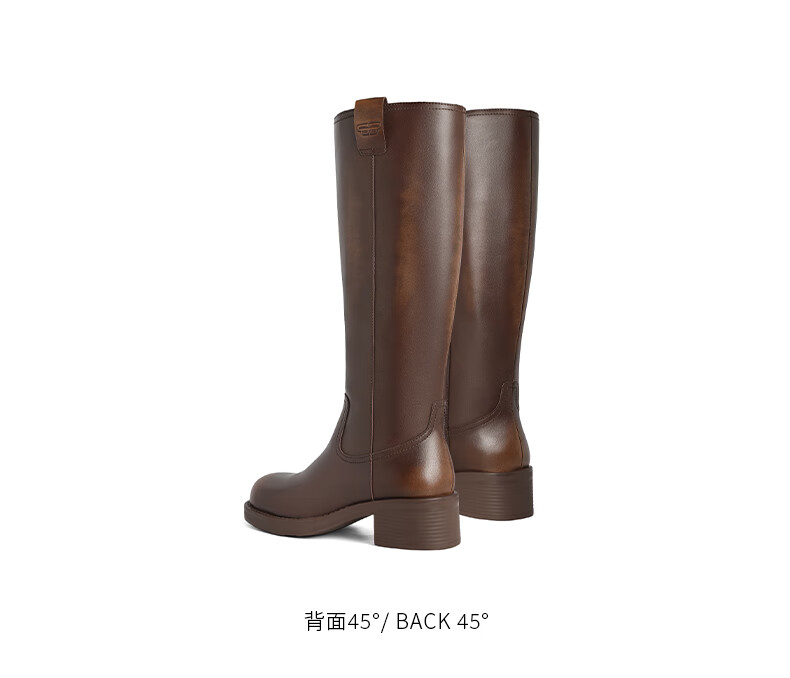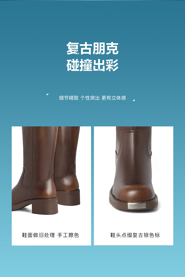 百丽擦色复古骑士靴女2023冬...