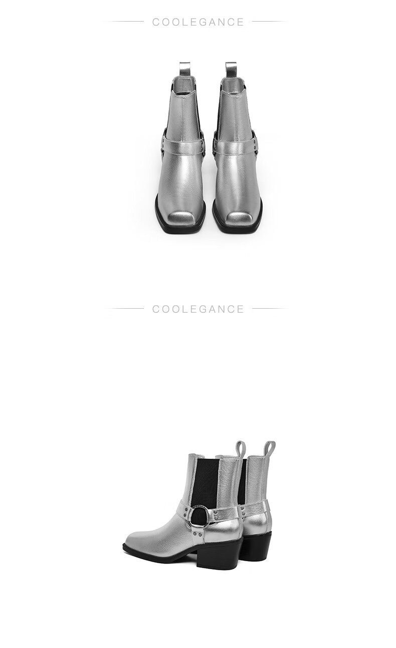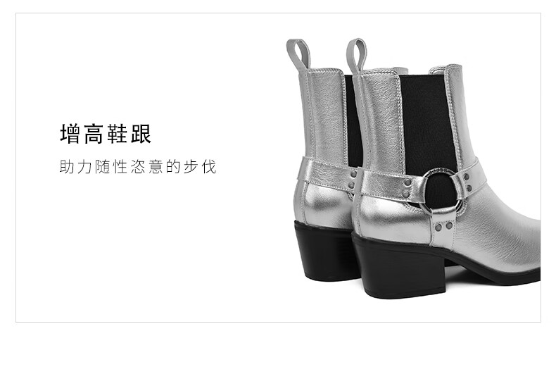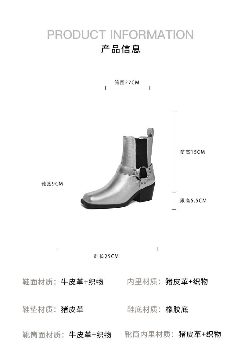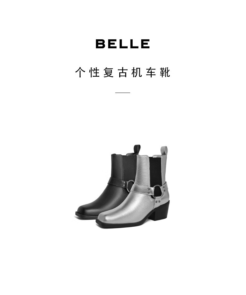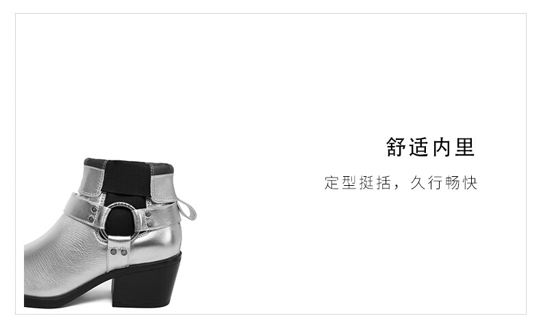 百丽小众切尔西靴女2023冬季新商场同款粗跟方头短靴BBJ64DZ3 银色 33