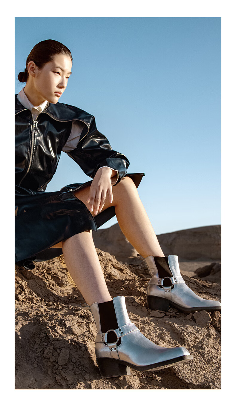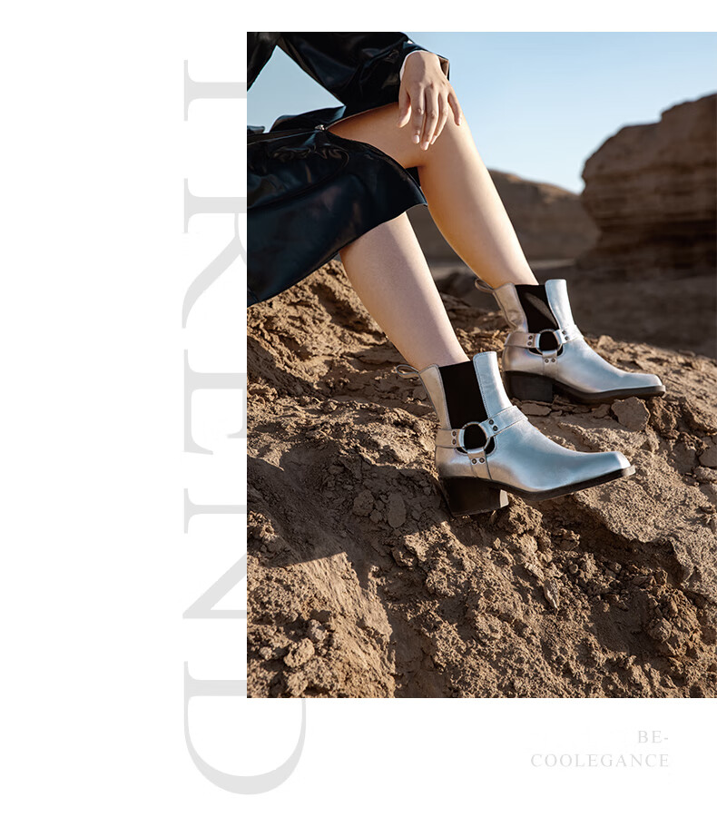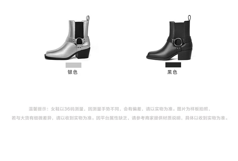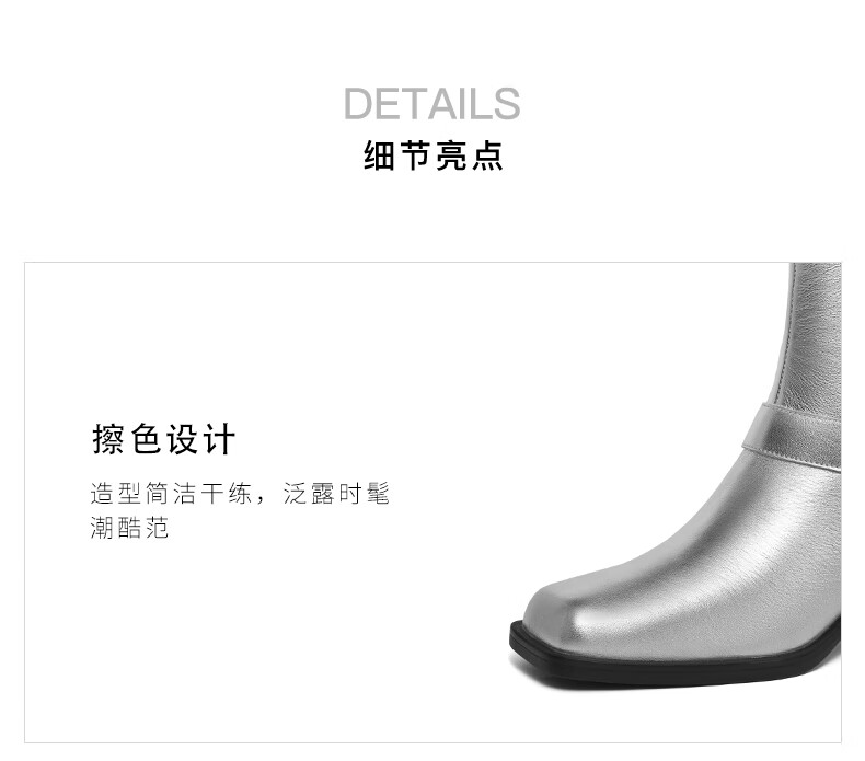 百丽小众切尔西靴女2023冬季新商场同款粗跟方头短靴BBJ64DZ3 银色 33