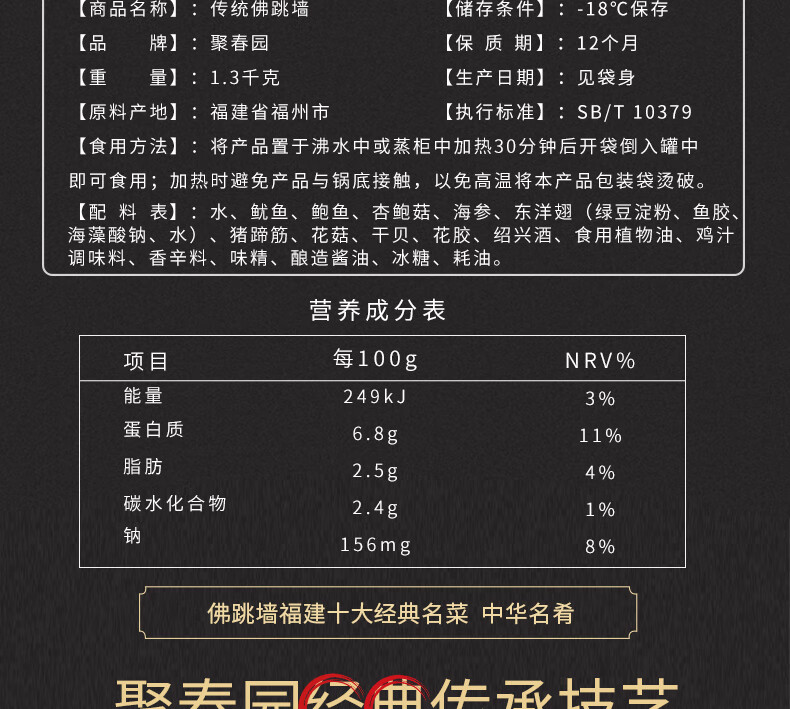聚春园官方经典传统佛跳墙盒装海参鲍鱼花胶加热即食盆菜正宗佛跳墙礼盒 瑞鼎佛跳墙1.3kg盒装