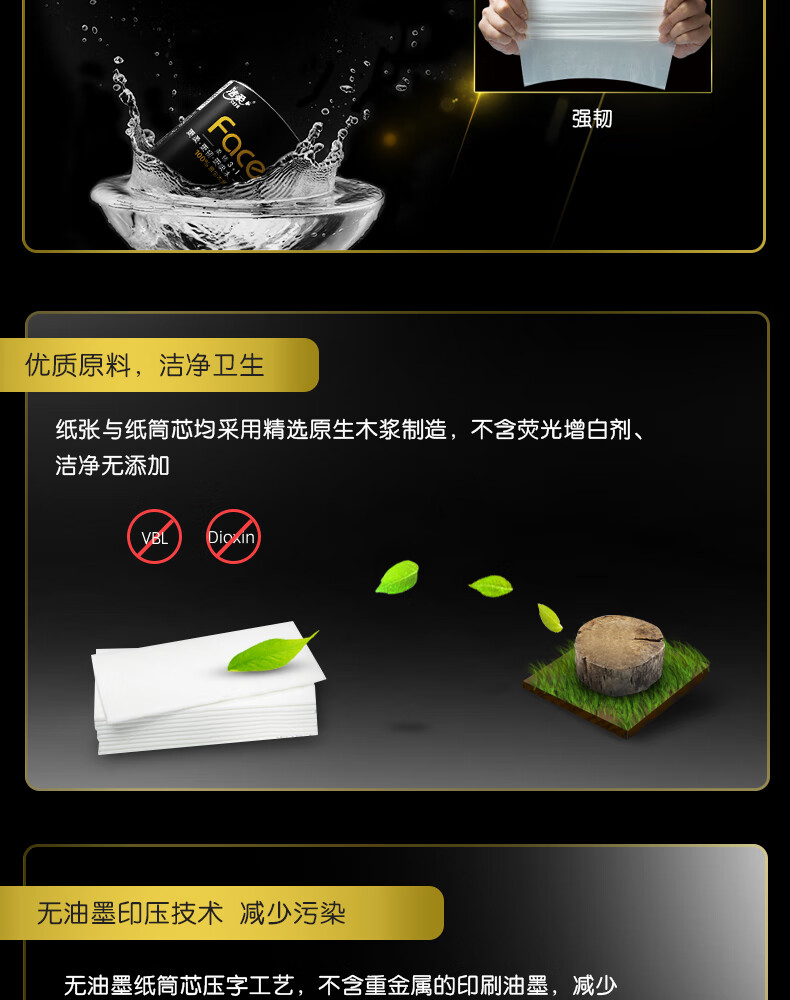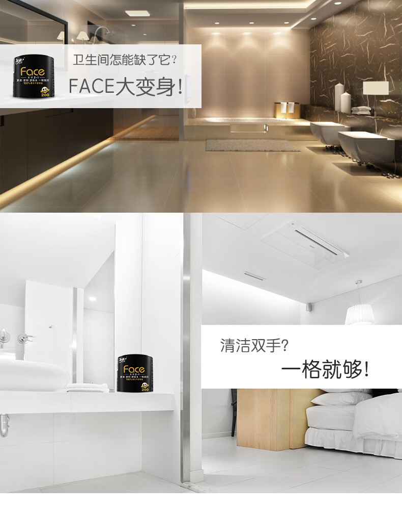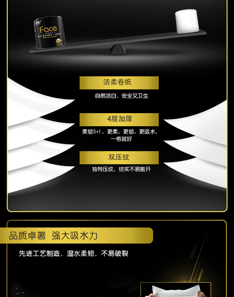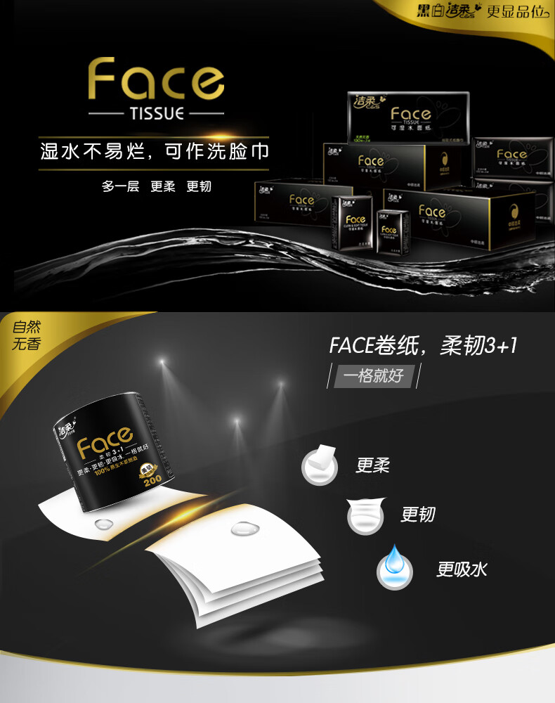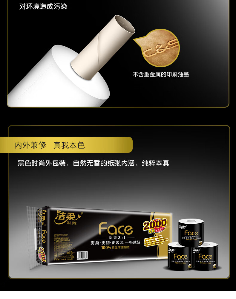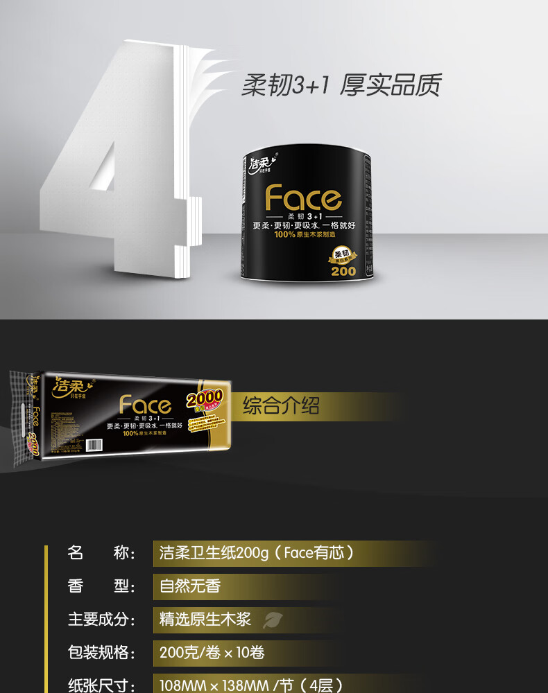洁柔卷纸 黑Face加厚4层200g卫生纸巾*10卷 母婴可用 冲厕易降解