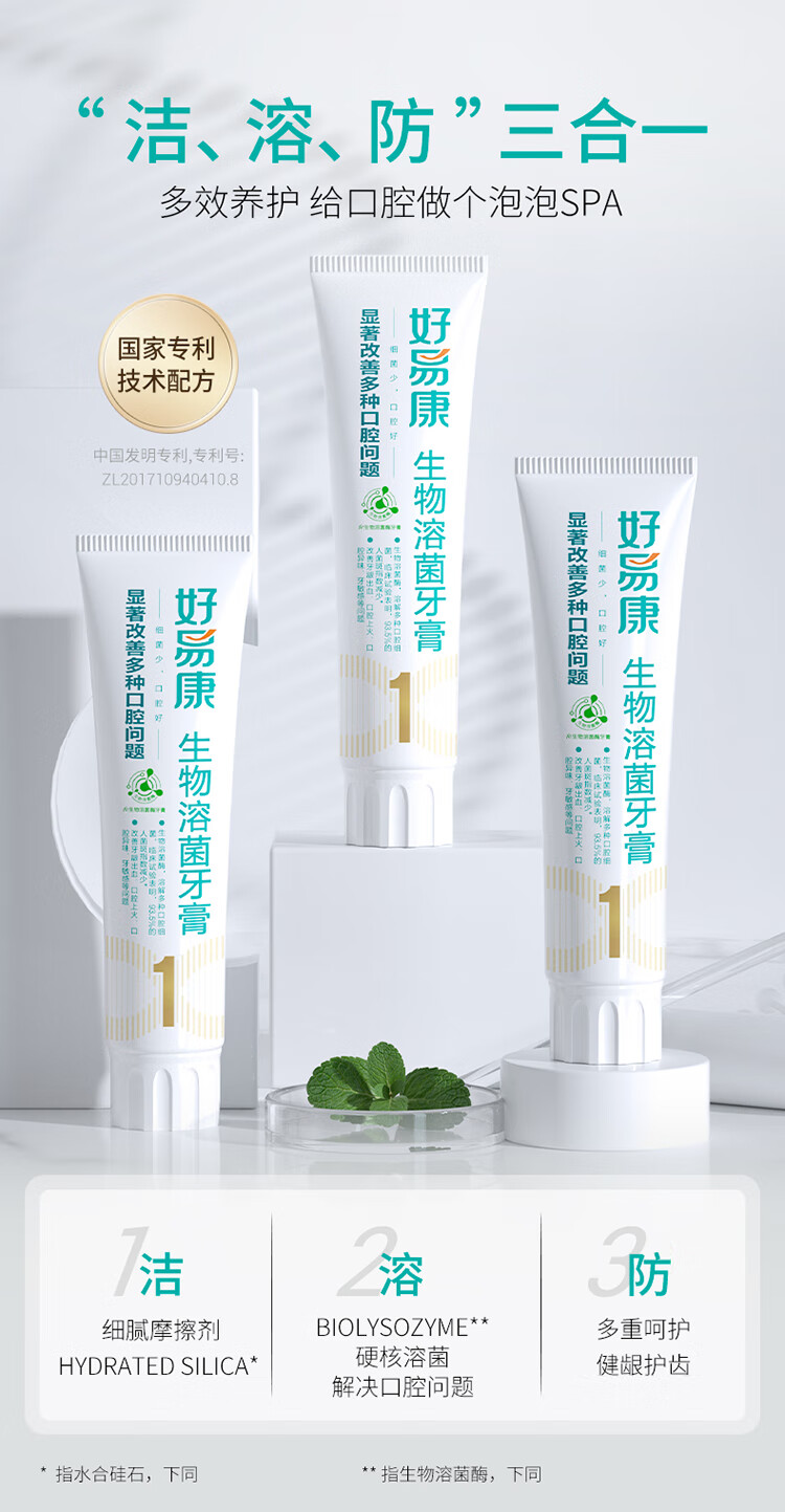 好易康 生物溶菌牙膏 清新口气亮白缓解口腔上火多效护齿1号3支装