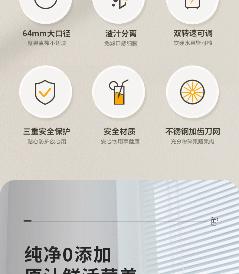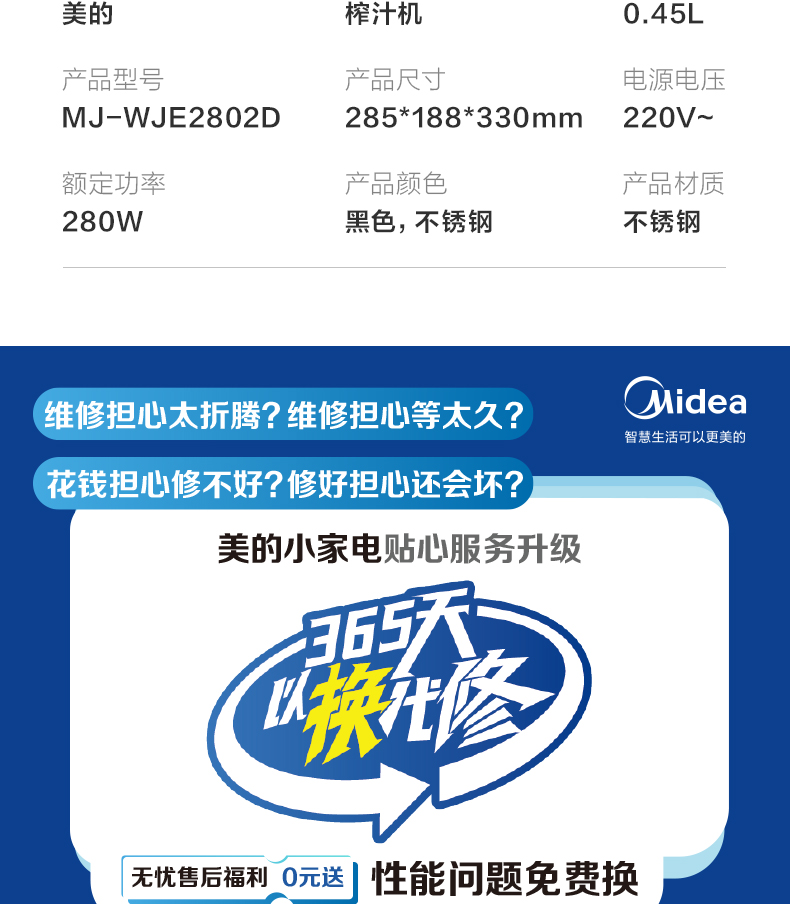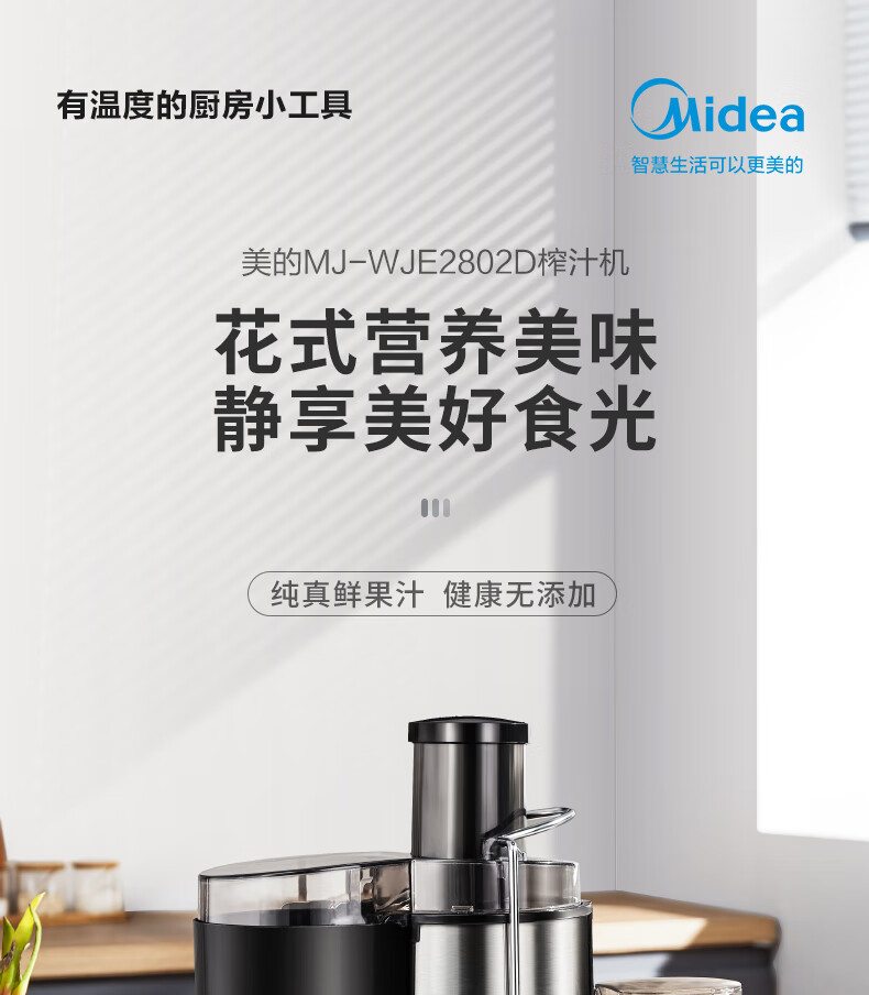 美的(Midea)压榨果汁原汁机细腻渣汁分离无残渣多功能料理机家用超高出汁率安全不锈钢榨汁机WJE2802D