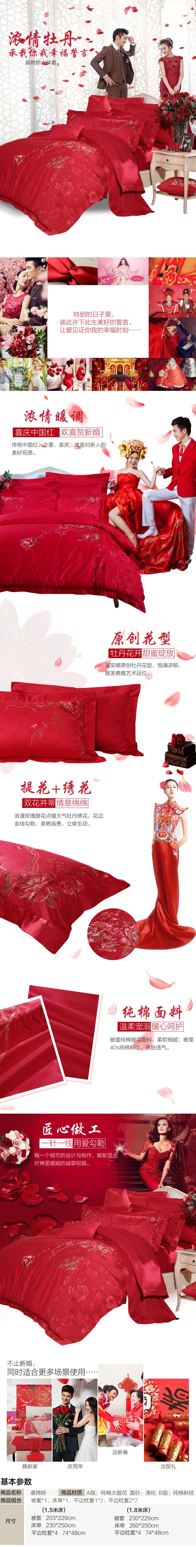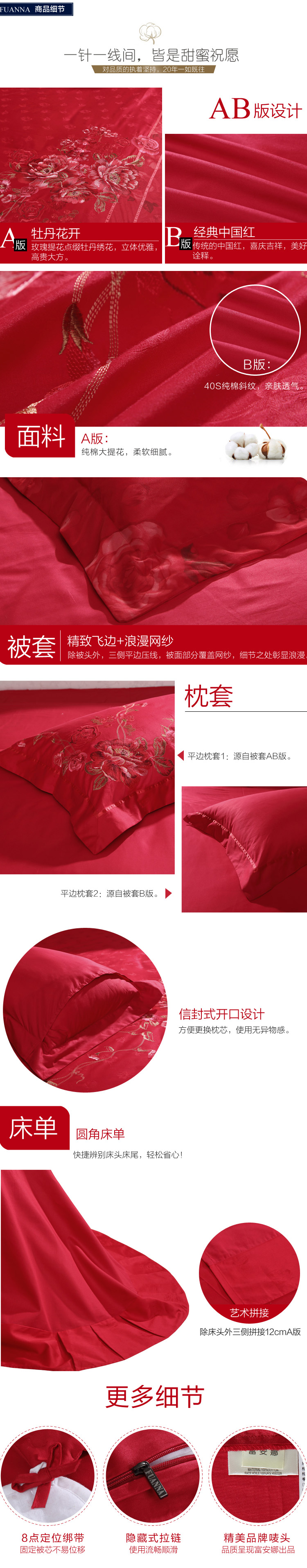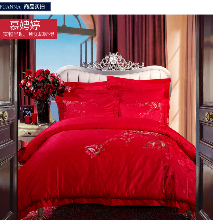 富安娜(FUANNA)家纺床品套件 纯棉婚庆绣花六件套 慕娉婷1.5米/1.8米床适用(203*229cm)红色