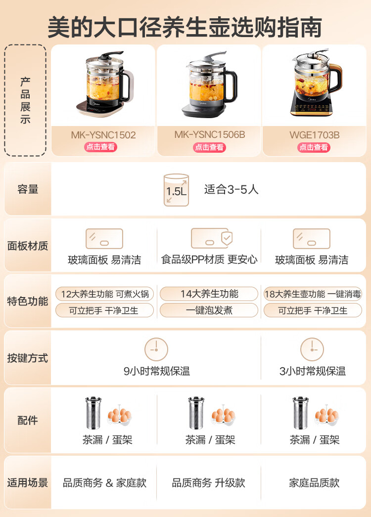 美的(Midea)养生壶宽口电水壶烧水壶1.5L大容量煮茶壶花茶壶智能煮茶器附带滤网*蛋架WGE1703b