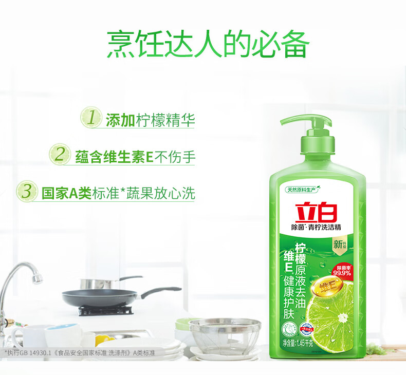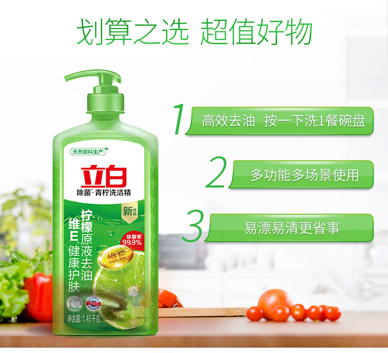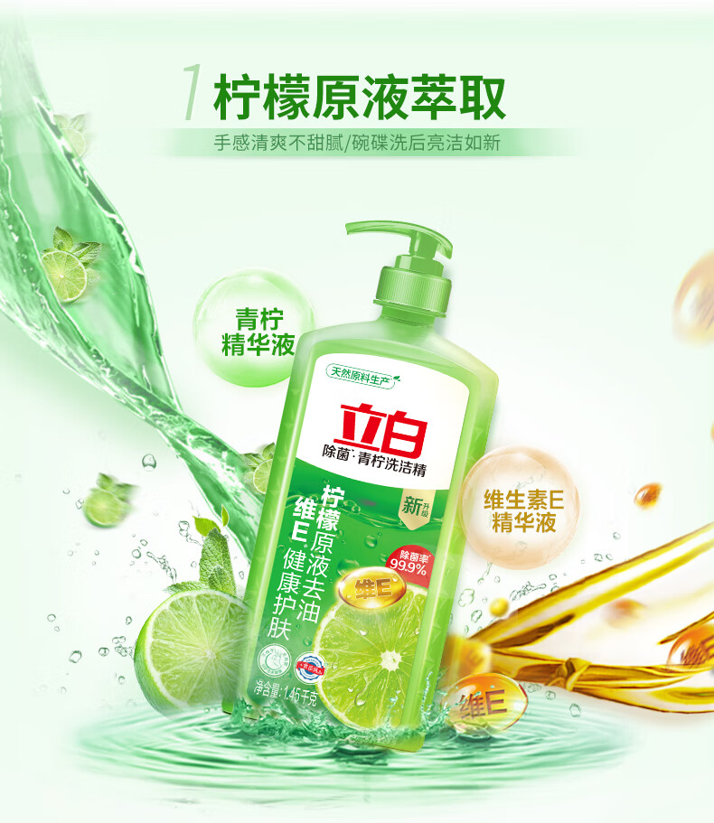 立白 青柠洗洁精1.45kg食品用维E精华不伤手去重油果蔬适用洗碗洗涤灵
