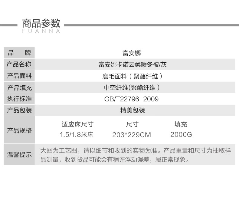 富安娜床上用品冬被芯保暖被子卡诺云柔暖冬被1.5/1.8米床(203*229cm)