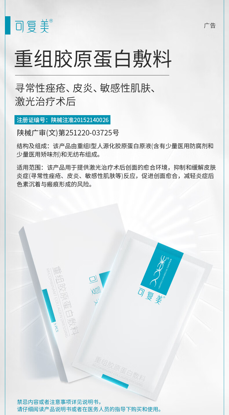 可复美 重组胶原蛋白敷料5贴 面部项目前后创面愈合 缓解泛红敏感肌肤痤疮皮炎