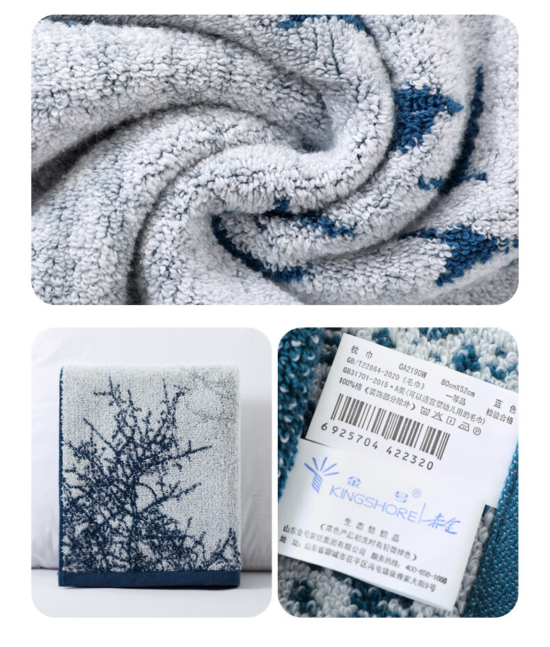金号 A类纯棉枕巾加大加厚枕巾单条装优雅水墨画蓝色186g52cm*80cm