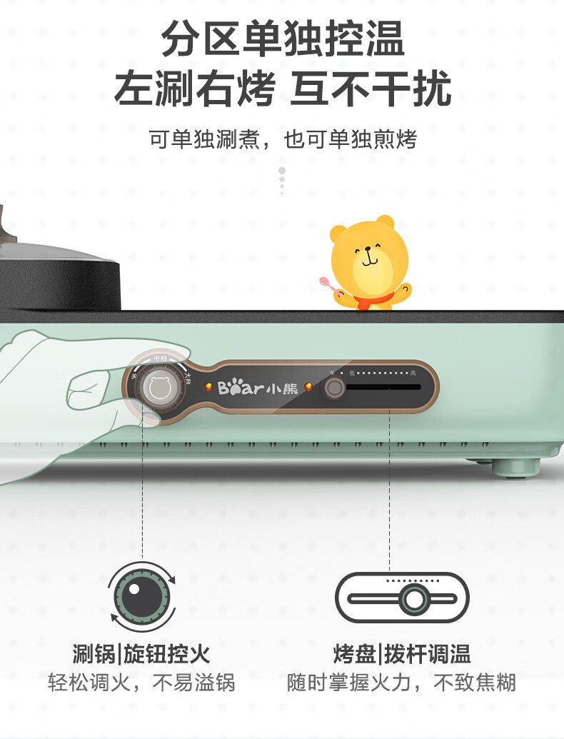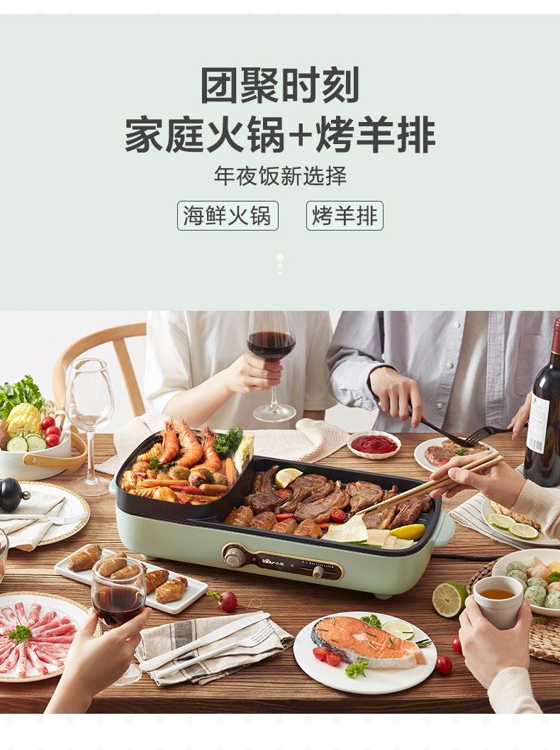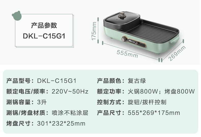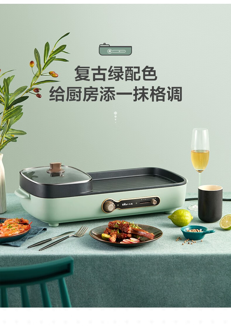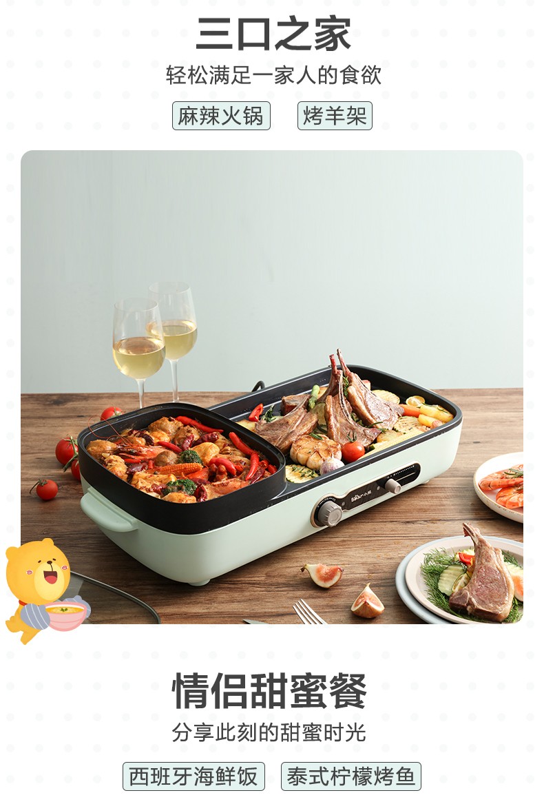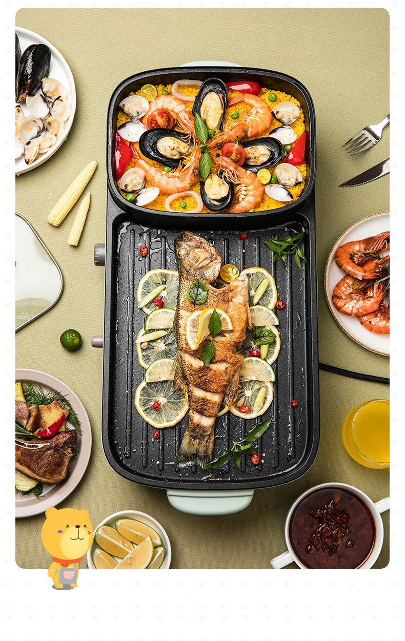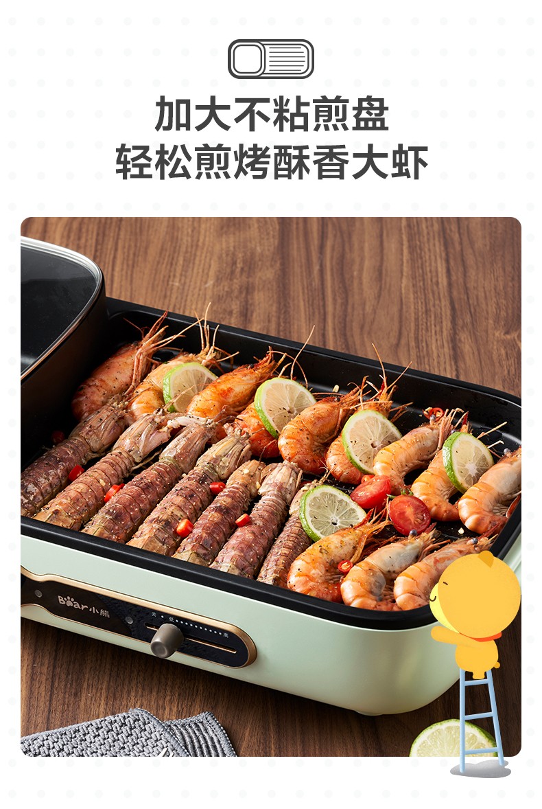 小熊(Bear)多功能料理锅 电烤炉网红煎涮烤一体锅烤肉锅电火锅 电烧烤炉家用无烟韩式煎烤盘 加深加大烤盘 DKL-C15G1