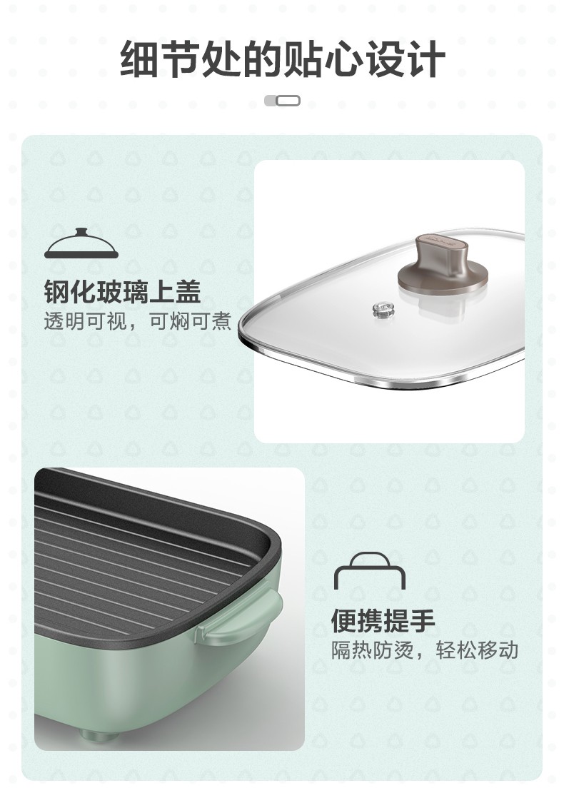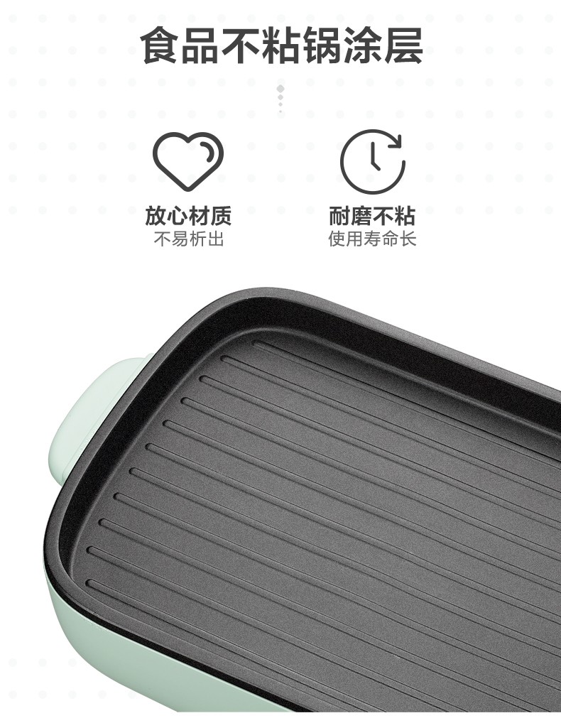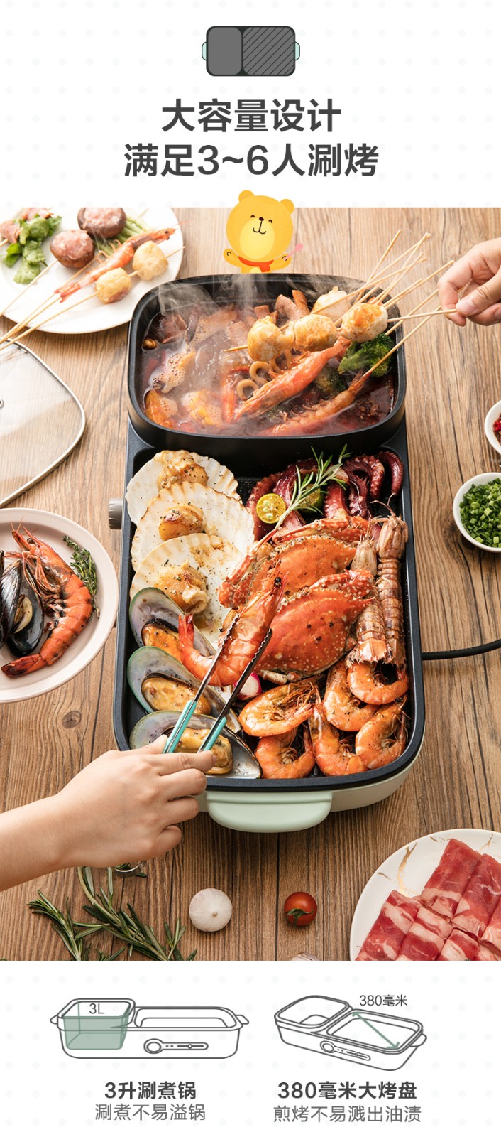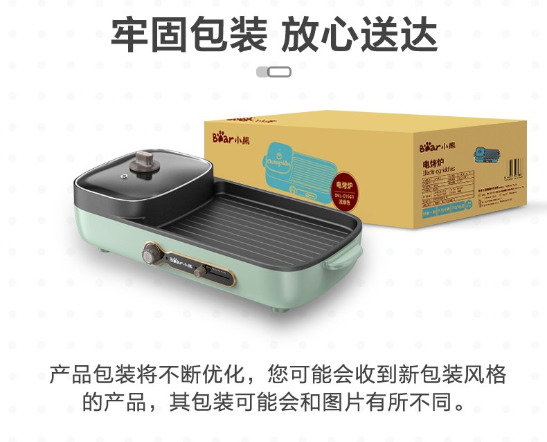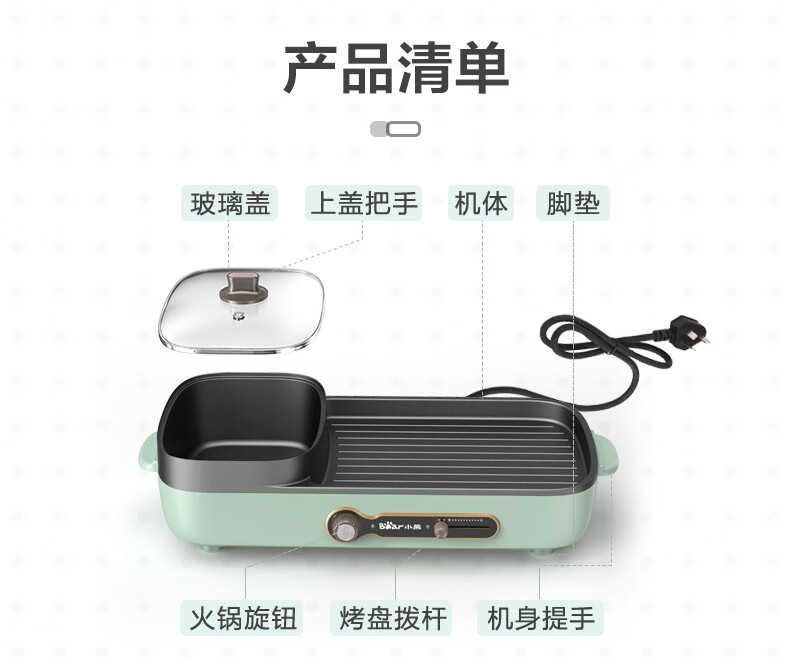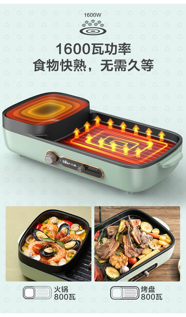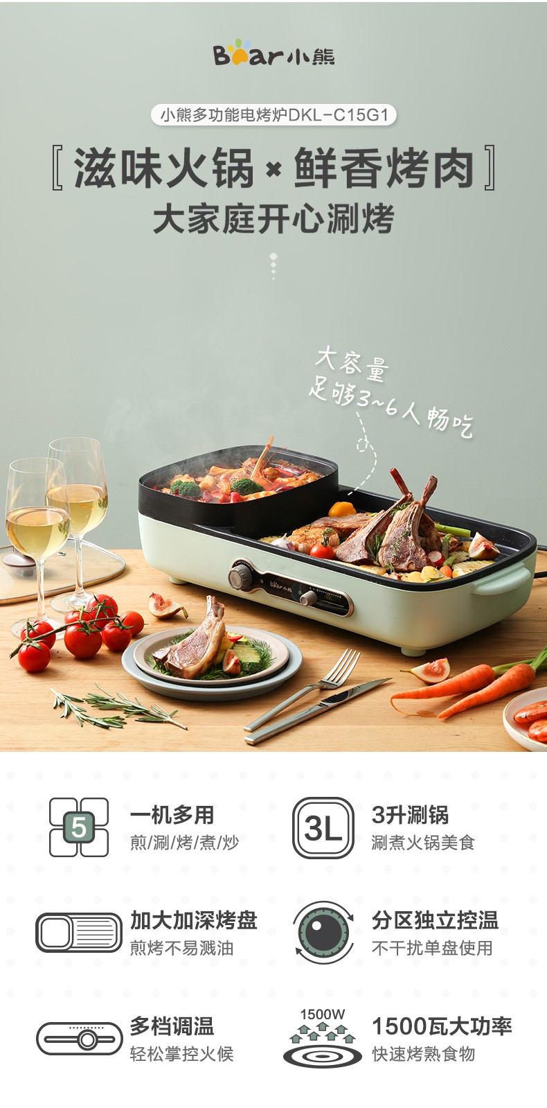小熊(Bear)多功能料理锅 电烤炉网红煎涮烤一体锅烤肉锅电火锅 电烧烤炉家用无烟韩式煎烤盘 加深加大烤盘 DKL-C15G1